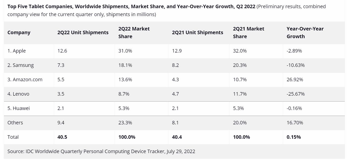 По данным исследовательской компании IDC, мировые поставки планшетов во втором квартале этого года достигли 40.5 млн устройств, показав рост на 0.15%. Отмечается, что рынок планшетов показал лучшие, чем ожидалось ранее, результаты, вопреки инфляционному давлению и геополитическим рискам, а также проблемам с производством в Китае из-за ковидных ограничений. Лидером рынка планшетов во втором квартале была компания Apple с отгрузками в объёме 12.6 млн устройств и долей 31%. У компании Samsung второе место с отгрузками в объёме 7.3 млн устройств и долей 18.1%. Обе лидирующие компании снизили свои отгрузки в сравнении со вторым кварталом годом ранее на 3% и 10.6% соответственно. Третье место занимает компания Amazon с отгрузками в объёме 5.5 млн устройств и долей 13.6%, она, наоборот, нарастила отгрузки на 26.9%.