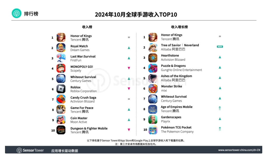 По данным исследовательской компании SensorTower, мобильная игра Honor of Kings от компании Tencent лидирует в мире в октябре по объёму выручки, следом за ней идет игра Royal Match. В пятерке лучших мобильных игр по доходам также Last War: Survival, Monopoly Go! и Endless Winter. Глобальные расходы мобильных геймеров в магазинах приложений App Store и Google Play находятся на уровне $6.55 млрд, что оказалось на 0.7% меньше в сравнении с аналогичным периодом годом ранее. Самый большой доход обеспечивает рынок США, там геймеры тратят на игры около $2 млрд или 31% от всех расходов на игры. Второй по объёму выручки рынок — Китай с долей 18%, за ним следует рынок Японии с долей 13.8%. Всего за октябрь мобильные игры были загружены в количестве 3.9 млрд раз, на 4.8% больше в сравнении с результатами этого же периода прошлого года. Лидирует по объёму загрузок Индия с 1.29 млрд загрузок — это 17% от всех загрузок мобильных игр, на втором и третьем местах США и Бразилия.