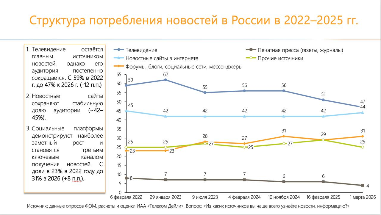 Аналитическое агентство TelecomDaily провело в марте-апреле 2026 года исследование трансформации медиапотребления в России. Аналитики изучили данные Mediascope Cross Web за 2023-2025 годы, структуру реферального трафика 20 ведущих СМИ по данным SimilarWeb за февраль 2026 года, опросы ФОМ с февраля 2022 по март 2026 года, а также провели глубинные интервью с топ-менеджерами крупнейших российских изданий. Основной вывод исследования: пользователи все чаще потребляют новостной контент на платформах-агрегаторах и в социальных сетях, не переходя на сайты самих изданий. Среднемесячная аудитория в «Дзене» превышает аудиторию собственных сайтов у 13 из 18 крупнейших федеральных СМИ более чем в 2,4 раза. Согласно опросам ФОМ, доля россиян, предпочитающих узнавать новости через социальные сети, блоги и мессенджеры, выросла с 23 процентов в феврале 2022 года до 31 процента в марте 2026 года. При этом доля зрителей новостей на телевидении за тот же период снизилась с 59 до 46 процентов. Новостные сайты для поиска информации стабильно выбирали 42-45 процентов россиян, однако внутри этого сегмента происходит перераспределение активности в пользу агрегаторов.