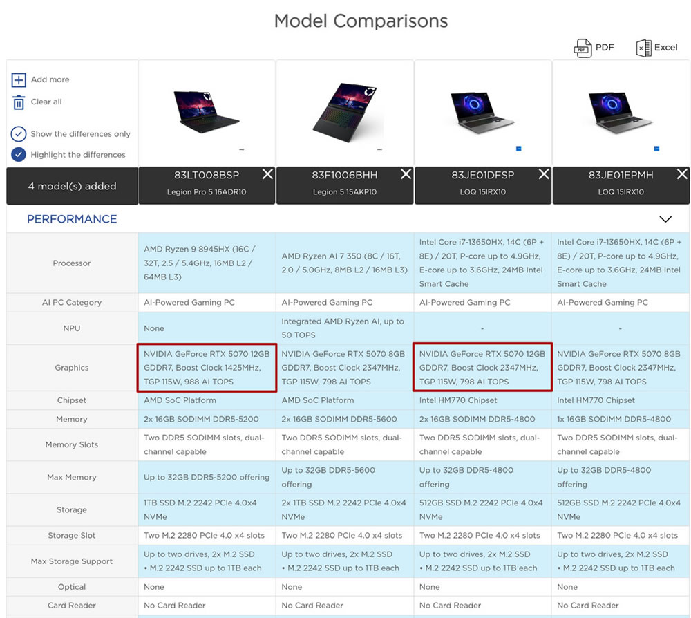 Компания Lenovo подтвердила наличие мобильной видеокарты GeForce RTX 5070 с увеличенным объёмом памяти в своих новых ноутбуках Legion. В опубликованных спецификациях фигурирует версия графического ускорителя с 12 ГБ памяти GDDR7, что на 4 ГБ больше текущих моделей с 8 ГБ. Несмотря на отсутствие комментария от Nvidia, документация производителя даёт веские основания доверять ранее появившимся слухам. В частности, для модели Legion Pro 5 16ADR10 заявлена связка с процессором AMD Ryzen 9 8945HX и 32 ГБ оперативной памяти, а также твердотельным накопителем PCIe 4 х 4 объёмом 1 ТБ.