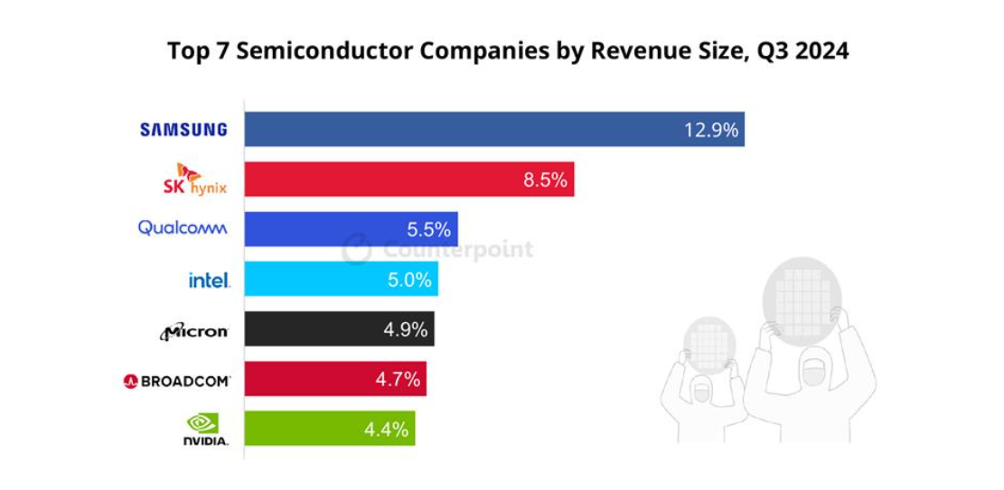 По данным исследовательской компании Counterpoint, объем глобальных продаж на рынке полупроводников вырос в прошедшем квартале текущего года на 17%. Лидером мирового рынка полупроводников является Samsung, успеху компании способствует высокий спрос в сегменте памяти. В нынешнем квартале спрос на полупроводники продолжит расти, основными драйверами роста являются спрос на быструю память и решения для работы с искусственным интеллектом. Так, по итогам третьего квартала выручка компании Nvidia увеличилась на 94%. Общий объём продаж в секторе полупроводников в третьем квартале текущего года превысил $158 млрд. Основными игроками рынка полупроводников, помимо Samsung, также являются компании SK Hynix, Qualcomm, Intel, Micron, Broadcom, Nvidia. На долю Samsung приходится 12.9% доходов этого рынка, у SK Hynix 8.5%, доля Qualcomm составляет 5.5%.