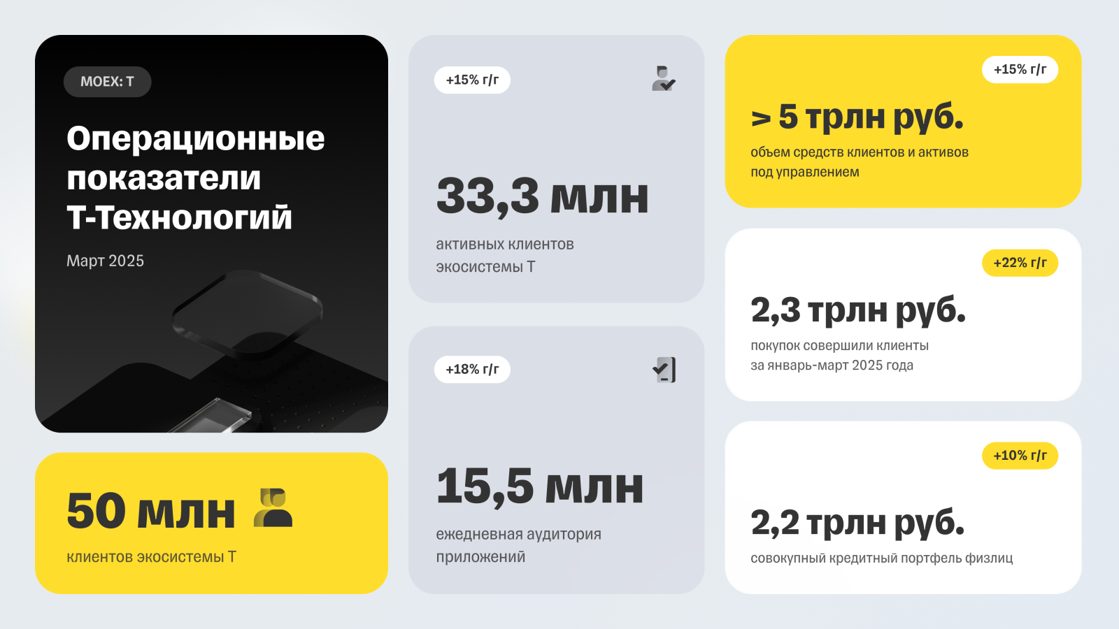 Общее количество клиентов экосистемы «Т» превысило 50 млн, увеличившись на 19% год к году, сообщает компания «Т-Технологии» по итогам марта 2025 года. Количество активных пользователей выросло на 15% год к году и достигло 33,3 млн. Общий объем покупок по картам за январь-март 2025 г. составил 2,3 трлн рублей, увеличившись на 22% год к году. Консолидированный кредитный портфель составил 2,6 трлн руб., показав незначительный рост год к году и к февралю 2025 года. Объем средств клиентов и активов под управлением на счетах клиентов вырос на 15% год к году, превысив 5 трлн рублей. Совокупный инвестиционный портфель группы увеличился на 31% год к году — до 1,6 трлн рублей. Прибыль банковского бизнеса группы в январе-марте 2025 года составила 15 млрд рублей.