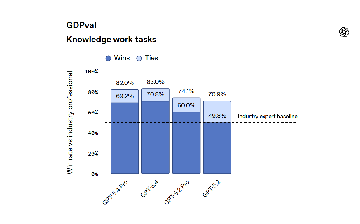 Модель показала высокие результаты в тестах на выполнение профессиональных задач: в бенчмарке GDPval она получила лучшие результаты в 83,0% случаев. Особое внимание уделили работе с офисными документами и таблицами, где точность модели выросла до 87,3%. Кроме того, по информации разработчиков, GPT-5.4 стала на 33% реже допускать фактические ошибки по сравнению с версией 5.2. Улучшенная визуальная система теперь поддерживает изображения высокого разрешения до 10,24 МП.
