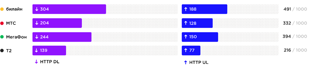 «МегаФон», занявший второе место, показал высокие пиковые скорости загрузки — до 156 Мбит/с, а на Троицкой линии — до 216 Мбит/с. Однако по стабильности и успешности сессий оператор уступил лидеру: доля неуспешных попыток загрузки составила 1,71% против 0,35% у «Билайна». МТС набрал 332 балла и занял третье место. Оператор продемонстрировал слабые результаты по успешности сессий: 2,63% неудачных попыток загрузки и 8,57% — выгрузки данных. В 90% измерений скорость загрузки превышала лишь 5,34 Мбит/с. Оператор Т2 с результатом 217 баллов занял четвёртое место, показав самую низкую успешность сессий (7,07% неудачных попыток загрузки) и невысокие пороговые скорости. Таким образом, исследование показало, что «Билайн» обеспечивает наиболее стабильный и предсказуемый доступ в Интернет в условиях высокой нагрузки в московском метро, в то время как другие операторы, демонстрируя высокие пиковые скорости, уступают в постоянстве качества соединения. Тестирование проводилось по методологии ETSI TR 103559 в режиме, максимально приближенном к реальной эксплуатации сети пассажирами.