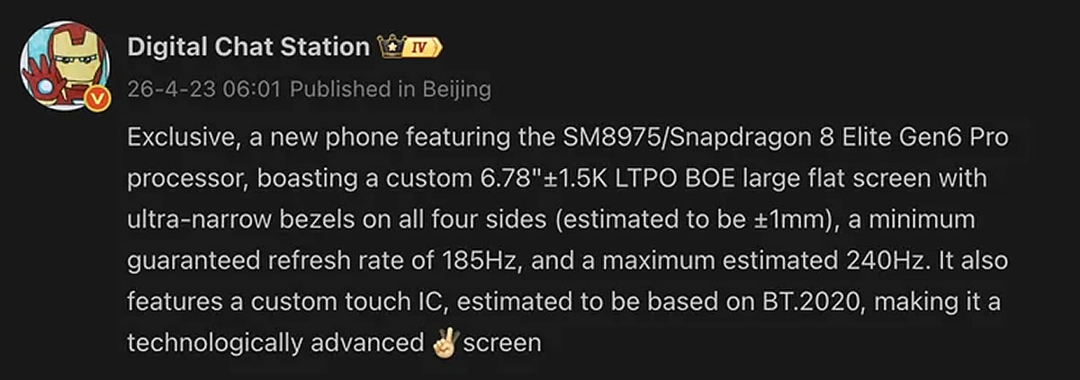 Стали известны ключевые технические характеристики дисплея готовящегося к выпуску флагманского смартфона OnePlus 16. Согласно утечке от известного инсайдера Digital Chat Station, устройство получит экран с частотой обновления до 240 Гц и ультратонкими рамками. Дисплей диагональю 6,78 дюйма будет изготовлен компанией BOE с использованием технологии LTPO и разрешением 1,5K. Его особенностью станет поддержка широкого цветового охвата BT.2020 и применение технологии Low-Injection Pressure Overmolding, которая позволит сократить ширину рамок до 1 мм. Частота обновления экрана варьируется от минимальных 185 Гц до максимальных 240 Гц, что выше, чем у предстоящего iQoo 16 и текущего OnePlus 15 — у обоих 165 Гц. Также известно, что аппарат оснастят процессором Snapdragon 8 Elite Gen 6 Pro, созданным по 2-нм техпроцессу, основной камерой с новым сенсором, 200-мегапиксельным перископическим телеобъективом и аккумулятором емкостью 9000 мАч. Для сравнения, у предшественника емкость батареи составляла 7300 мАч. Выход OnePlus 16 ожидается в конце текущего года в качестве флагмана компании.