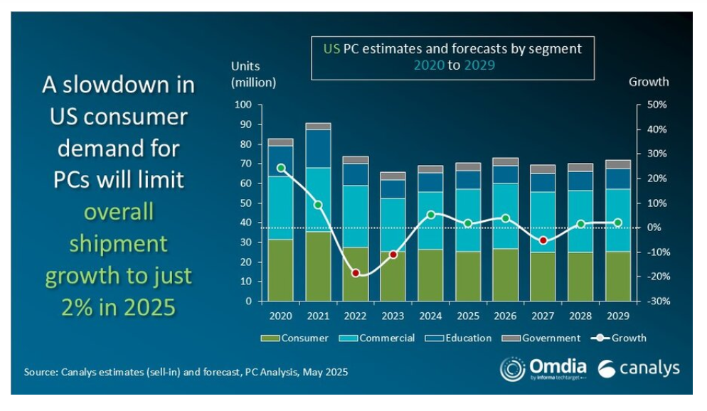 По оценке исследовательской компании Canalys, в США поставки ноутбуков и настольных компьютеров выросли за первый квартал на 15%. Всего было продано 16.9 млн устройств. Такой результат был достигнут благодаря стремлению покупателей застраховаться от рисков повышения цен, вызванных объявленными со стороны администрации Дональда Трампа планами повышения ввозных пошлин на товары из Китая и других стран Азиатско-Тихоокеанского региона. При этом прогнозы на текущий год не превышают 2% роста по этой группе товаров. Ожидается, что поставки настольных компьютеров и ноутбуков на потребительском рынке в нынешнем году снизятся на 4.2%, до уровня 25.1 млн устройств; коммерческий сегмент покажет рост на 7.9%, до уровня 31.7 млн устройств. Закупки в сфере образования принесут 9.3 млн продаж, что будет соответствовать снижению на 2.4%. Поставки для государственных органов обеспечат 4 млн продаж при росте на 6.4%. Лидером первого квартала является компания HP с продажами 4.1 млн, на втором месте компания Dell с результатом 3.8 млн устройств, и замыкает тройку лидеров рынка в первом квартале компания Lenovo с продажами в объёме 3.1 млн.