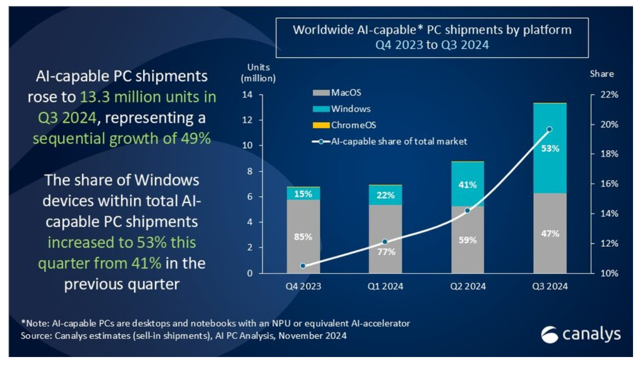 По данным исследовательской компании Canalys, в третьем квартале текущего года поставки персональных компьютеров с поддержкой искусственного интеллекта выросли до 13.3 млн устройств, что соответствует росту на 20%. К устройствам с поддержкой искусственного интеллекта относят персональные компьютеры, на которых задачами обработки ИИ занимается выделенный блок NPU. В новых персональных компьютерах доля предложений с такими NPU достигла уже 49%. Отмечается, что большая часть таких решений — это компьютеры на операционной системе Windows, они доминируют в сегменте с долей 53%. Поддержка Copilot+ пока реализована на решениях на основе процессоров серии Qualcomm Snapdragon X. У компании AMD появились продукты линейки Ryzen AI 300, а у Intel — продукты линейки Lunar Lake. Ожидается, что реализация возможностей Copilot+ для продуктов на AMD и Intel появится уже в этом месяце, что приведёт к ещё большему росту сегмента персональных компьютеров с использованием искусственного интеллекта. Но, по оценке экспертов, рынку еще предстоит убедить покупателей в необходимости перехода к подобным решениям, и в следующем году общий объём продаж устройств с поддержкой искусственного интеллекта будет составлять около 10% от всех продаж персональных компьютеров.
