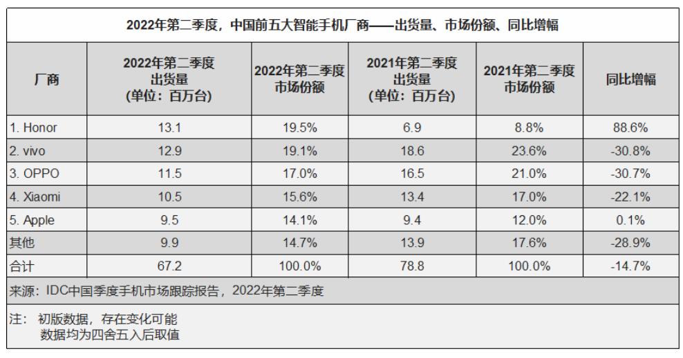 По данным исследовательской компании IDC, поставки смартфонов на китайском рынке снизились во втором квартале на 14.7%. Всего на рынок Китая было поставлено 67.2 млн устройств. Впервые лидером рынка стала компания Honor с отгрузками в объёме 13.1 млн устройств. Продажи Honor выросли на 88,6%, в то время как все остальные китайские бренды продемонстрировали отрицательный динамику. Так, продажи идущей на втором месте компании Vivo составили 12.9 млн устройств, снижение её продаж превысило 30%, также на 30% снизились продажи бренда OPPO, а у Xiaomi продажи сократились на 22%. Находящаяся на пятом месте компания Apple сохранила свои поставки на прежнем уровне, продав 9.5 млн смартфонов, что всего на 0.1% больше показателей годом ранее.