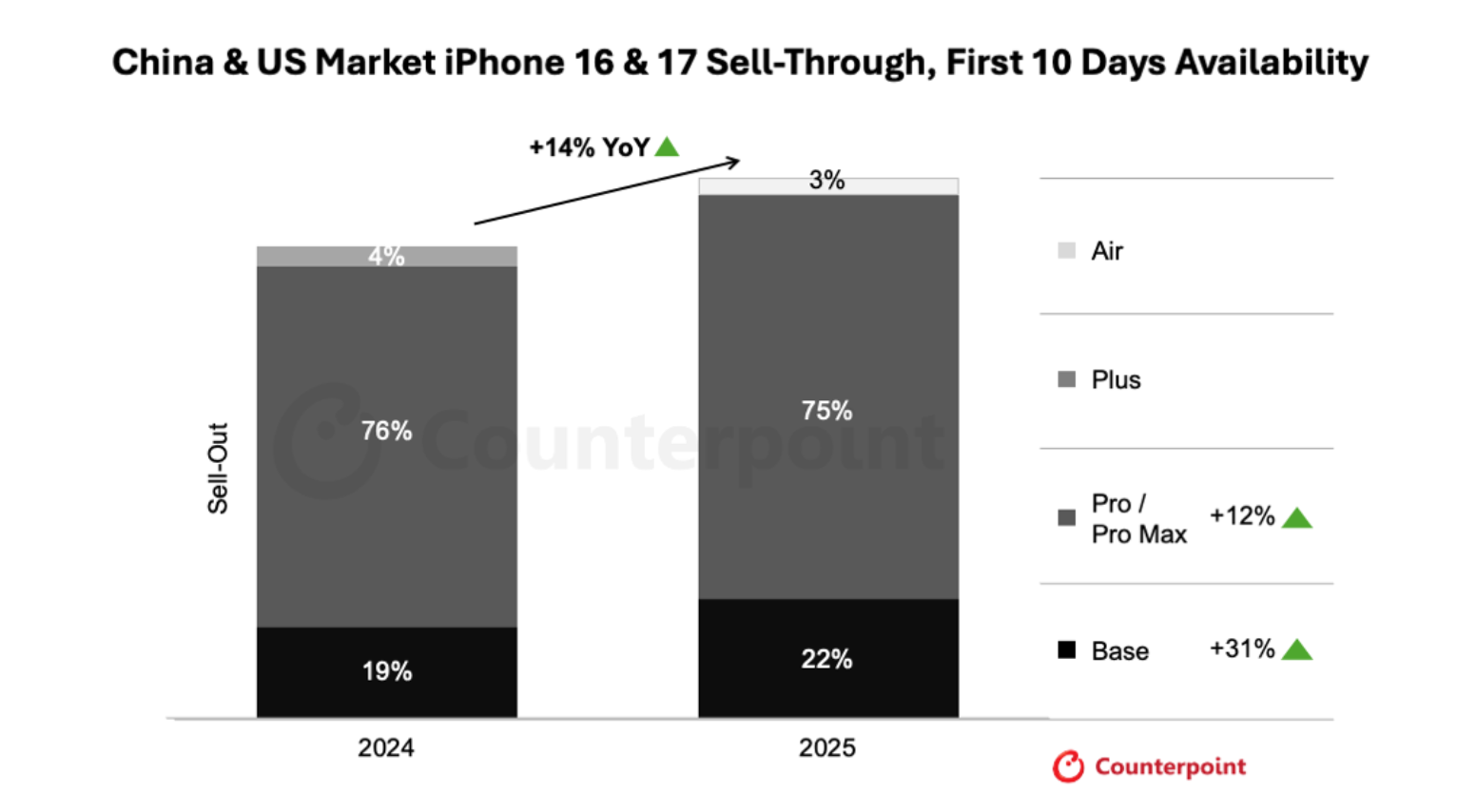Основным двигателем этого роста стал базовый iPhone 17. Его продажи подскочили практически на треть. В Китае именно эта модель вызвала наибольший ажиотаж, почти удвоив количество проданных единиц по сравнению с базовым iPhone 16. Аналитики Counterpoint Research объясняют успех тем, что это хорошее предложение за свои деньги. По словам старшего аналитика Мэнмэн Чжан, потребителей привлекли значительные улучшения — лучший чип, обновленный дисплей, увеличенный базовый объем памяти и улучшенная селфи-камера, — при сохранении прошлогодней цены. Дополнительные скидки и купоны в каналах продаж сделали покупку особенно привлекательной для китайских потребителей.