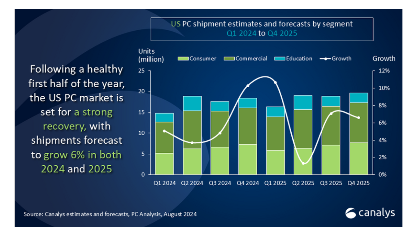 По оценке исследовательской компании Canalys, во втором квартале текущего года продажи персональных компьютеров в США выросли на 4% и достигли уровня 18.9 млн устройств, при этом спрос на ноутбуки был выше в сравнении со спросом на настольные решения. Прогнозируется, что в этом году на рынке США будет продано около 70 млн устройств, что превысит показатели продаж прошлого года на 6%, а на следующий год продажи подрастут ещё на 6% и составят 74 млн устройств. Коммерческий сектор нарастит закупки перед окончанием поддержки операционной системы Windows 10. В последнем квартале крупные предприятия увеличили закупки на 12%, обычные потребители — на 3%, а малый и средний бизнес добавил 6%. США стремятся стать лидером по внедрению компьютеров с поддержкой искусственного интеллекта, что может придать дополнительный стимул рынку и обеспечить уверенный рост продаж в сегменте персональных компьютеров.