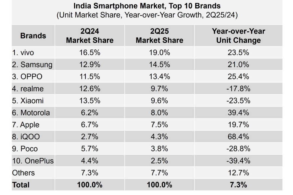 По оценке исследовательской компании IDC, в первой половине текущего года рынок смартфонов Индии вырос на 0,9% и достиг уровня 70 млн устройств. Рост за второй квартал составил 7,3%. Компания Vivo лидирует на индийском рынке уже шесть кварталов подряд с долей 19%. У компании Samsung второе место с долей 14,5%, компания OPPO поднялась на третье место с долей 13,4%, четвертое место занимает realme с долей 9,7%, а компания Xiaomi расположилась на пятом месте с долей 9,6%. Шестое место у компании Motorola, её доля на рынке 8%. Отмечается, что компания Apple занимает только седьмую строчку рейтинга лидеров, причём более половины продаж Apple составили модели последнего поколения iPhone 16. Доля Apple составляет 7,5%. В десятку лидеров рынка с заметными долями входят также компании iQOO с долей 4,3%, Poco с долей 3,8% и OnePlus с долей 2,5%.