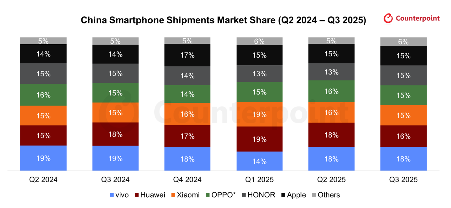 Apple показала более высокий, чем ожидалось, спрос на серию iPhone 17. В частности, модели Pro привлекли внимание покупателей благодаря значительным обновлениям дизайна. Модель iPhone 17 также хорошо продавалась, поскольку её минимальный объём хранилища был увеличен со 128 ГБ до 256 ГБ при сохранении стартовой цены. Флагманская серия Mi 17 от Xiaomi, запущенная в конце сентября, была хорошо принята рынком. Модели Pro вызвали особый интерес благодаря оригинальному дисплею на задней панели. Huawei продолжает сталкиваться с проблемами, в основном из-за ограниченной совместимости приложений в экосистеме HarmonyOS Next.