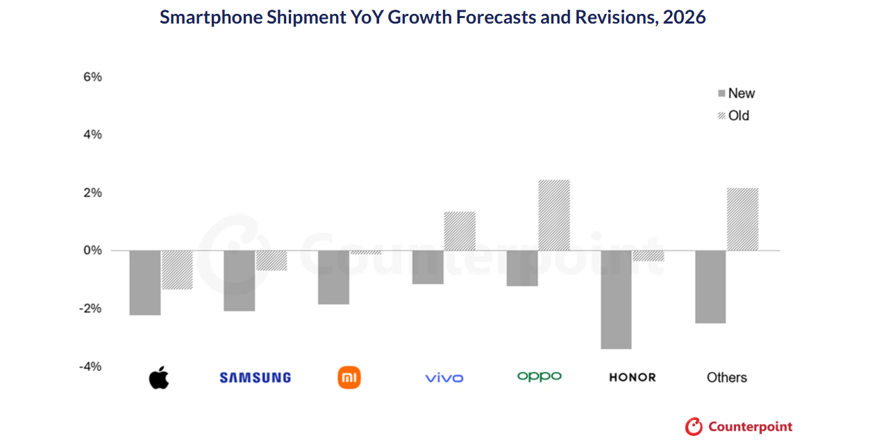 Аналитики агентства Counterpoint Research пересмотрели прогноз мировых поставок смартфонов на 2026 год в сторону снижения на 2,1%. Основной причиной эксперты называют нехватку оперативной памяти, что ведет к существенному росту себестоимости устройств. Наиболее заметные корректировки коснулись китайских брендов, таких как Honor, OPPO и vivo.