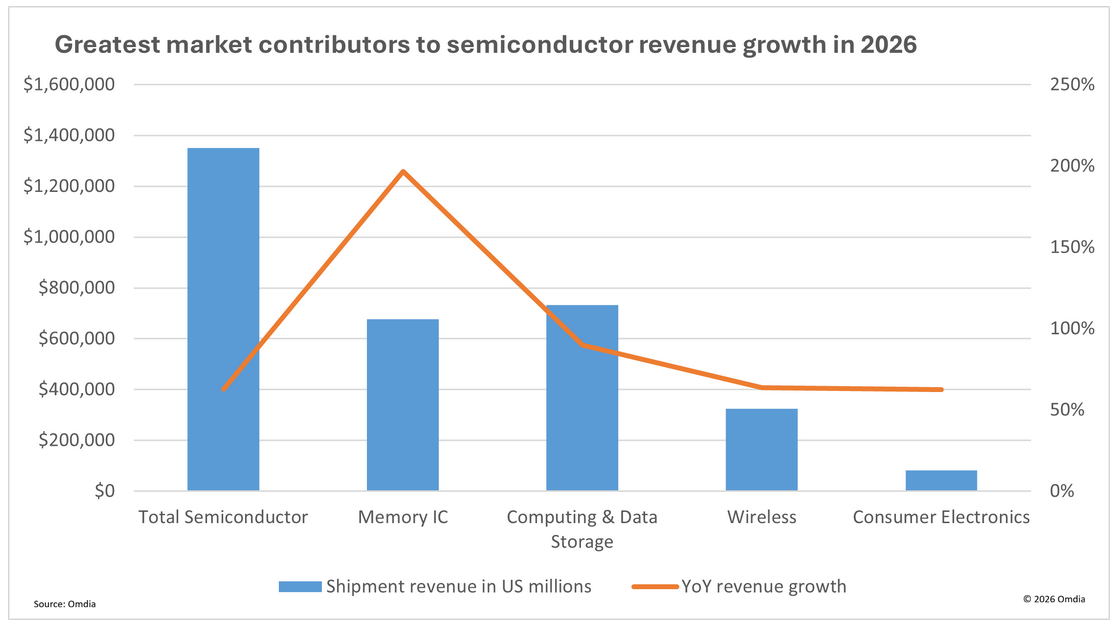 Аналитическая компания Omdia существенно скорректировала свои ожидания относительно доходов мировой полупроводниковой индустрии на 2026 год. Согласно новым данным, прогнозируемый рост выручки составит 62.7%. Основным фактором таких изменений стал беспрецедентный спрос на модули оперативной памяти DRAM и накопители NAND. По оценкам экспертов, объем сегмента DRAM может увеличиться почти в два раза, в то время как рынок NAND способен вырасти в четыре раза по сравнению с прошлым годом.
