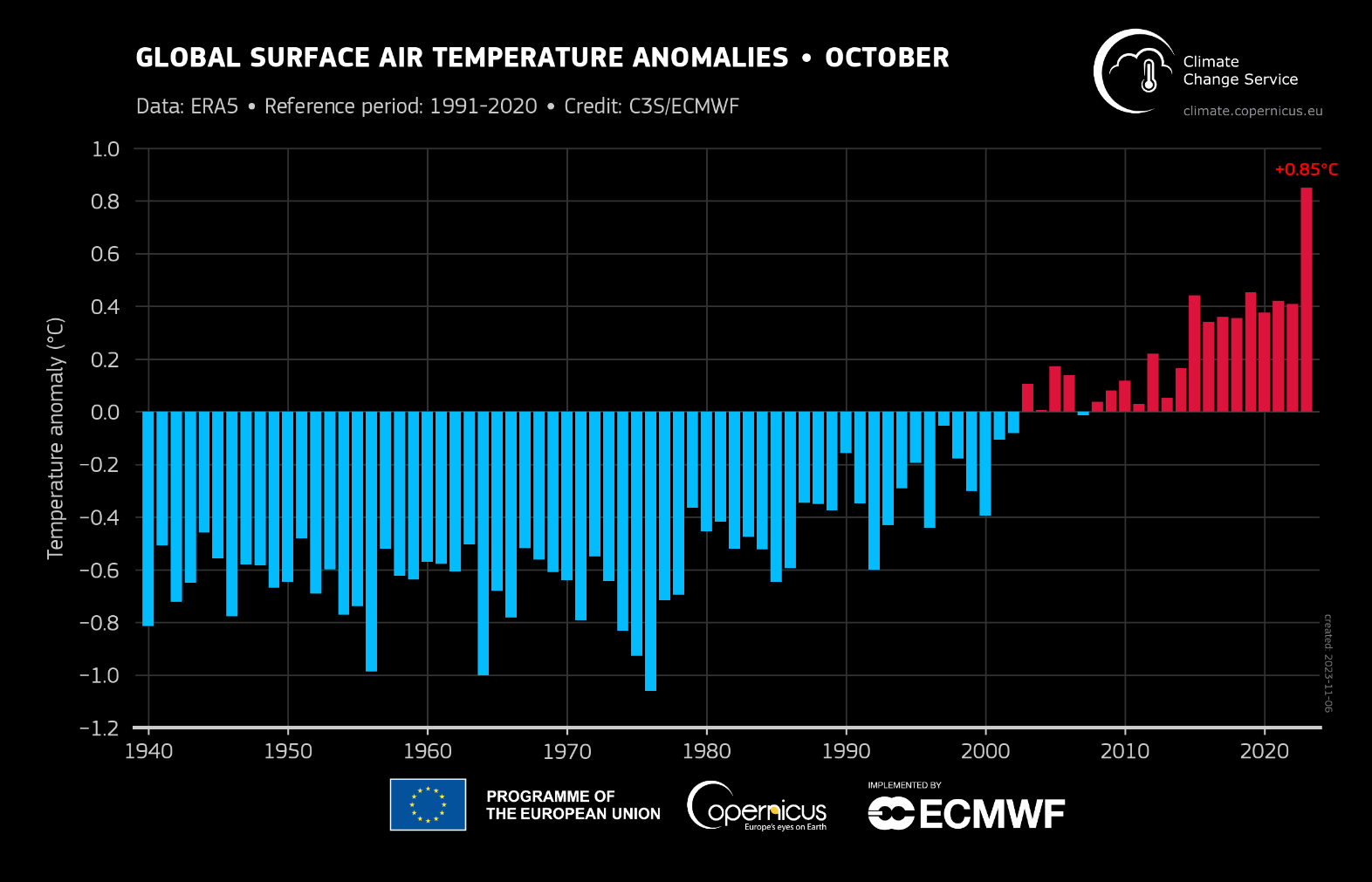 По сообщению европейской службы мониторинга окружающей среды Copernicus, прошедший октябрь стал самым тёплым октябрем за всю историю наблюдений со средней температурой приземного воздуха на уровне 15.3 градуса Цельсия. Средняя температура октября превысила предыдущий рекорд 2019 года на 0.4 градуса Цельсия. Температура в прошедшем октябре оказалась на 1.7 градуса Цельсия выше средних показателей температуры октября в доиндустриальный период, с 1850 по 1900 годы. В целом в период с января по октябрь 2023 года средняя глобальная температура стала самой высокой за всю историю наблюдений и превысила показатели доиндустриального периода на 1.43 градуса Цельсия. Измерения температуры поверхности моря зафиксировали в октябре значение 20.79 градусов Цельсия в принятой для измерений точке, что также оказалось самым высоким показателем за октябрь за все время измерений.