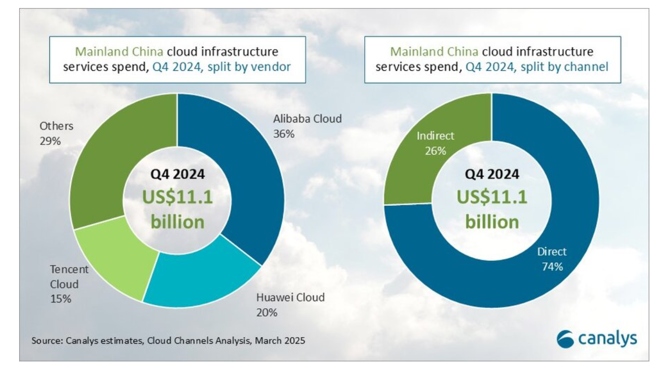 По оценке исследовательской компании Canalys, расходы на облачную инфраструктуру в материковом Китае выросли в четвёртом квартале на 14% и достигли уровня $11.1 млрд. За весь прошлый год в Китае на облачную инфраструктуру потратили $40 млрд по сравнению с $35.3 млрд, потраченными на облака в 2023 году. Быстрое внедрение технологий искусственного интеллекта привело к значительном росту расходов на облачную инфраструктуру, этому также способствует стремление Китая не отставать от США в гонке за первенство в области искусственного интеллекта. Лидером рынка в Китае по расходам на облачную инфраструктуру является Alibaba Cloud с долей 36%, второе место у компании Huawei Cloud с долей 20%, и третье место у компании Tencent Cloud с долей 15%. Начиная с февраля 2025 года ведущие поставщики облачных услуг еще больше начали расширять свои предложения инструментов искусственного интеллекта, что, в свою очередь, требует дальнейшего наращивания мощностей облачной инфраструктуры.