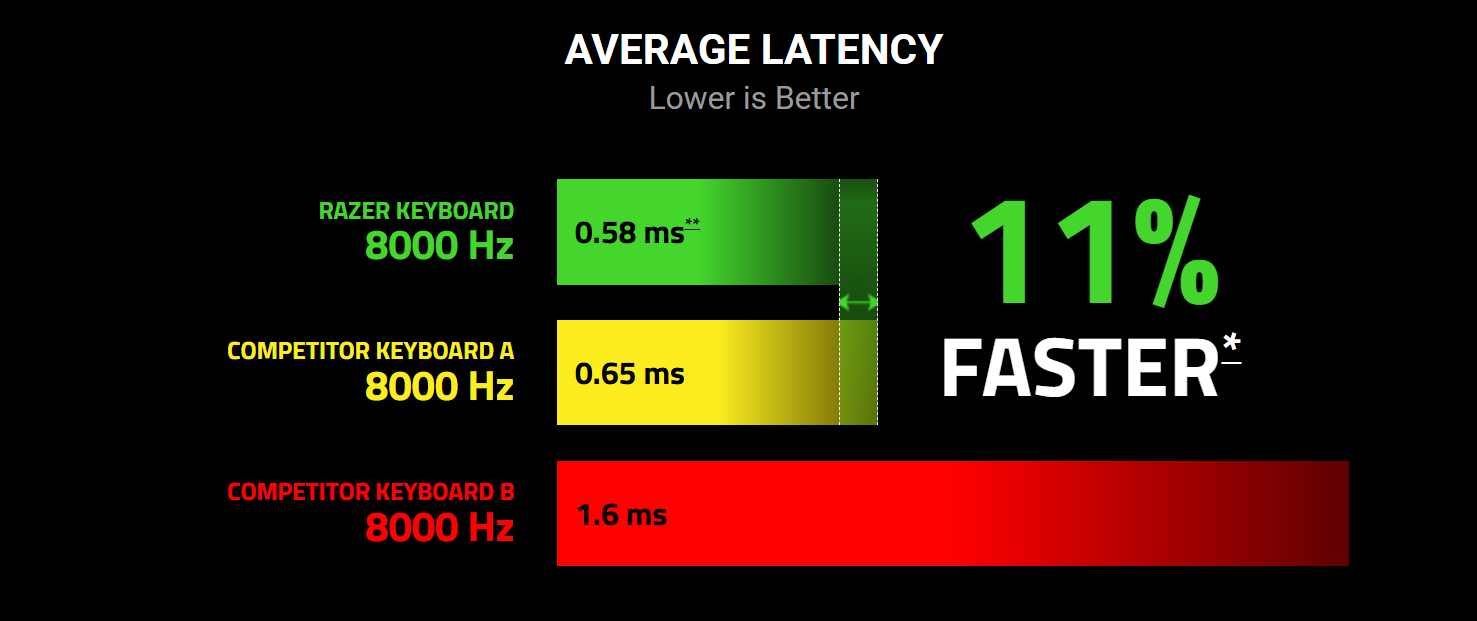 Клавиатуры Huntsman используют хорошо знакомую геймерам аналоговую оптическую технологию, но при этом получили существенные улучшения. Ключевой особенностью стала частота опроса 8000 Гц, что в сочетании с откалиброванными переключателями позволяет сократить минимальное время отклика. Это делает Huntsman V3 Pro 8KHz отличным инструментом для профессиональных соревнований, где каждая миллисекунда имеет значение. Аналоговые оптические переключатели Razer Gen-2 в сочетании с технологией HyperPolling 8000 Гц достигают времени задержки всего лишь 0,58 мс, что, по утверждению производителя, на 11% быстрее, чем у конкурентов, также использующих частоту опроса 8000 Гц.
