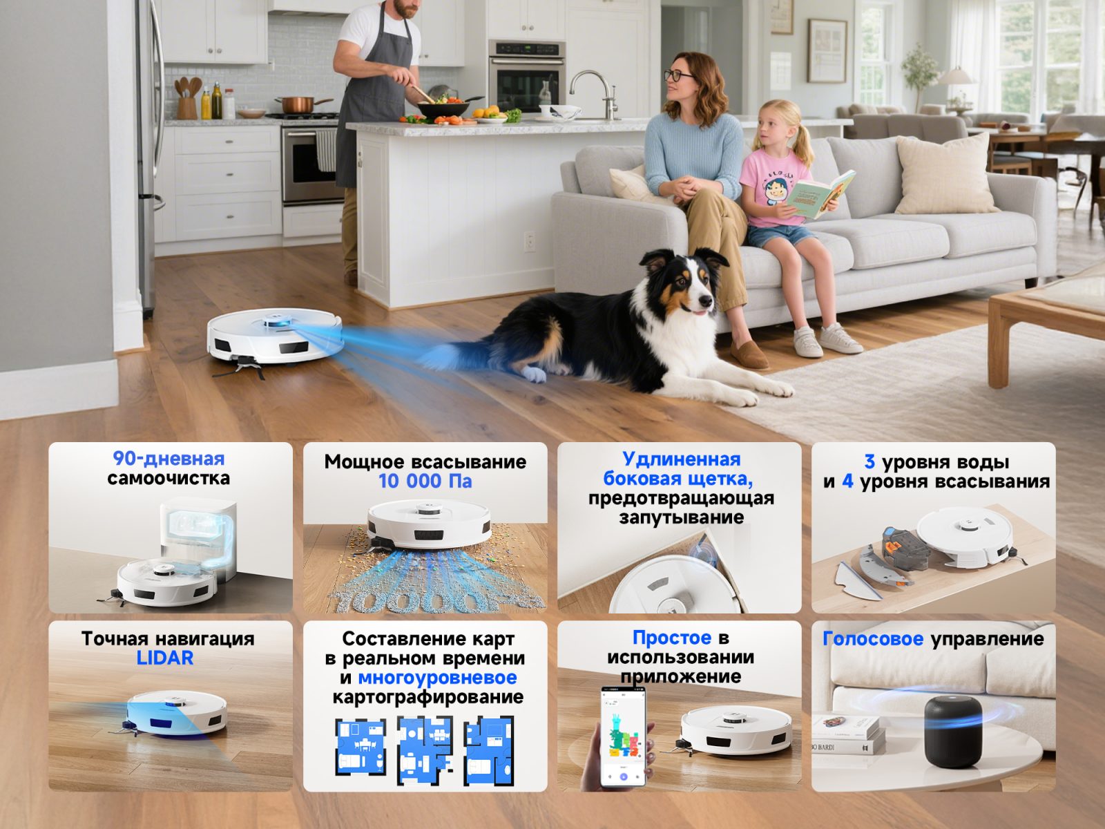 Уборка полностью автономна — можно дистанционно включить робота и вернуться уже в чистый дом. Через приложение легко задать зоны уборки, запретные зоны, расписание и осуществить другие персональные настройки. А используя голосовые помощники, можно запускать уборку простыми командами. Автоматическая станция сбора пыли с мощностью всасывания 18 000 Па и пылесборником объёмом 3,8 л автоматически опустошает контейнер после уборки. Пыль хранится герметично, замена мешка требуется максимум раз в 90 дней, что позволяет избежать контакта с пылью, что особенно важно для аллергиков. А аккумулятор ёмкостью 3200 мА·ч обеспечивает до 120 минут работы на одном заряде, что удобно для уборки больших помещений.