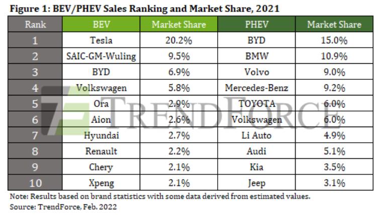 Ведущим брендом на этом рынке является компания Tesla с продажами на уровне 930 тысяч машин и долей рынка в 20.2%. Альянс SAIC-GM-Wuling занимает второе место. Отмечается, что если в 2020 году на долю десяти ведущих производителей в этом сегменте приходилось 65% продаж, то в нынешнем году они обеспечивают только 57% от общего объёма продаж, что говорит об обострении конкуренции и росте количества поставщиков автомобилей на новой энергии.