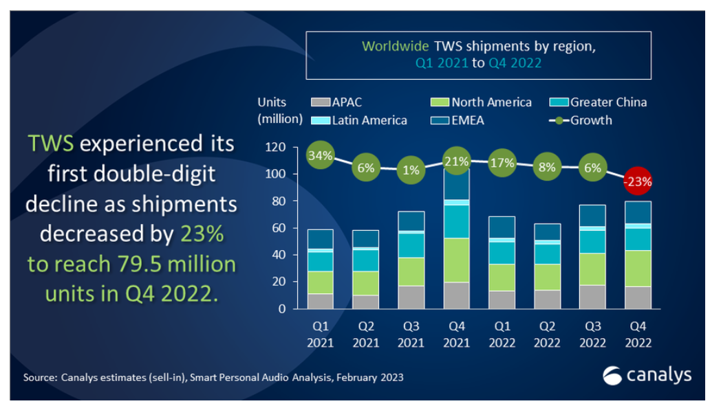 По данным исследовательской компании Canalys, мировой рынок интеллектуальных персональных аудиоустройств снизился в четвёртом квартале на 26%, до уровня 112.1 млн устройств. Сокращение коснулось всех категорий: TWS-наушники снизились на 23%, беспроводные наушники на 36%. Доля TWS-наушников постепенно растёт на рынке, в прошедшем году она выросла до 68% с 63% годом ранее. По прогнозам, рынок персонального интеллектуального аудио будет снижаться в этом году, сокращение может составить 5% от текущего уровня, TWS-наушники также будут снижаться на 2%. Нынешний год оценивается как непростой, ожидается обострение конкуренции среди поставщиков. На ситуацию на рынке будут активно влиять продажи на индийском рынке, местные игроки которого могут проявить себя и занять более весомое место на глобальном рынке.