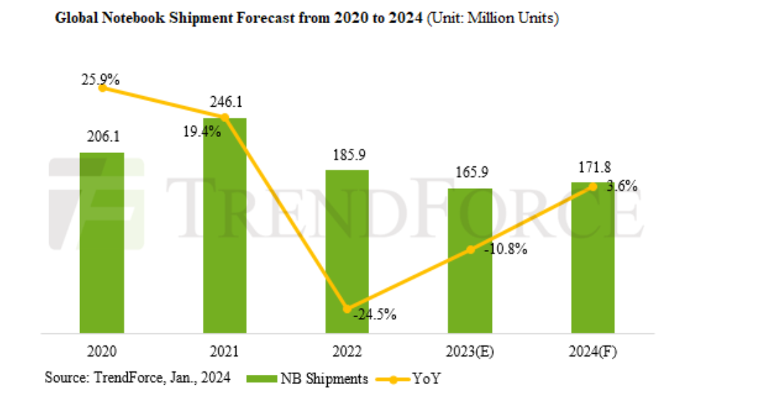 Исследовательская компания TrendForce прогнозирует рост рынка ноутбуков в 2024 году на 3.6%. В прошлом году рынок ноутбуков испытывал трудности и в итоге сократился на 10.8%, до уровня 166 млн устройств. Снижение стало меньше, чем годом ранее, и в 2024 году эксперты ожидают восстановления рынка. Поставки в 2024 году могут достичь 172 млн устройств. Проходящая в Лас-Вегасе выставка потребительской электроники CES 2024 демонстрирует новый тренд создания моделей, имеющих аппаратную поддержку работы с искусственным интеллектом. Повсеместная интеграция нейронных процессоров демонстрирует сдвиг в сфере персональных вычислений. Такие ноутбуки лучше подходят для выполнения задач обработки данных генеративного искусственного интеллекта и обеспечивают лучшее быстродействие, например, при использовании функции Copilot в операционной системе Windows 11. На первом этапе внедрение таких новаций будет востребовано бизнес-пользователями и создателями контента, а затем постепенно придёт и в массовый сегмент моделей.