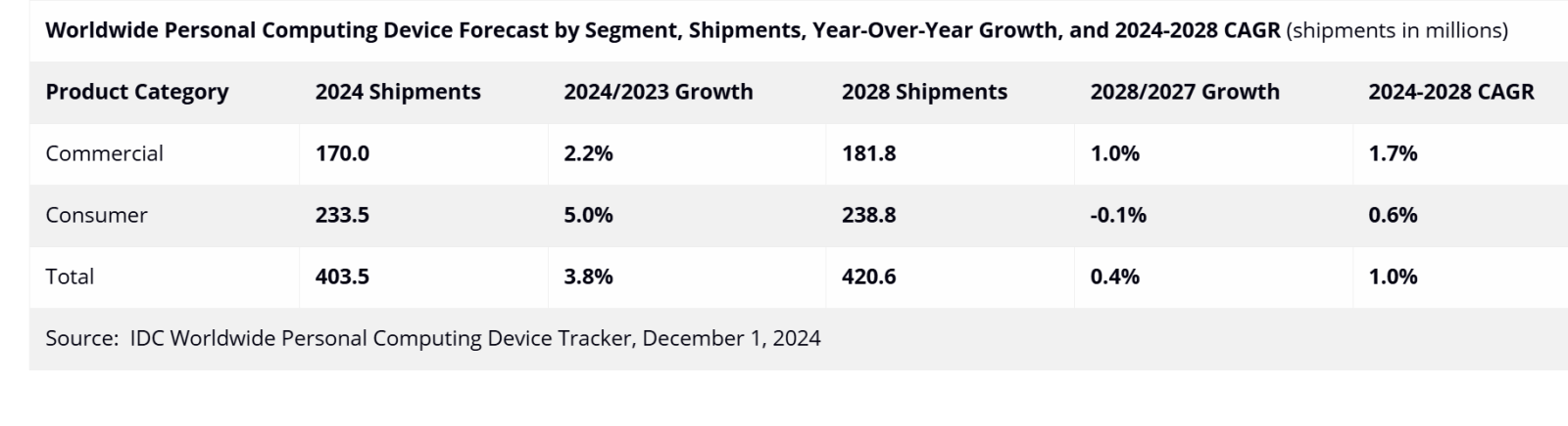 По оценке исследовательской компании IDC, рынок персональных компьютеров и планшетов в этом году вырастет на 3.8% и составит по итогам года 493.5 млн устройств. Отмечается, что рынок планшетов опережает по своему росту рынок персональных компьютеров, в этом году объём продаж планшетов увеличится на 9.8%. Рынок персональных компьютеров покажет более существенный рост в следующем году, пока ему прогнозируют рост на 4.3%. Одной из основных причин для такого роста называют увеличение продаж персональных компьютеров в коммерческом сегменте, где потребители будут переходить к использованию Windows 11. Прекращение поддержки Windows 10 — один из важных факторов, влияющих на коммерческий сегмент, что будет способствовать переходу коммерческих потребителей на новые компьютеры. В целом это приведет к тому, что рынок персональных компьютеров и планшетов в следующем году вырастет на 5.1%.