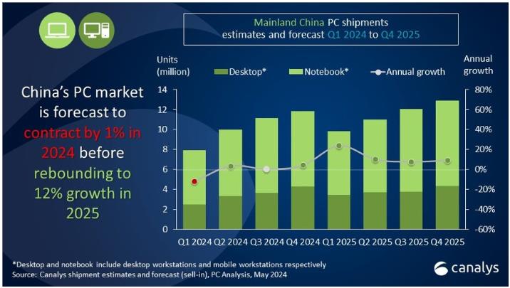 По данным исследовательской компании Canalys, рынок персональных компьютеров в Китае в нынешнем году ожидает сокращение на 1%. Резкий спад продаж наблюдался в первом квартале текущего года, падение достигло 12%, однако на глобальном рынке в это же время наблюдался рост продаж. Таким образом, траектория движения китайского рынка отличается от глобальной ситуации. Наиболее сильно на китайском рынке снизились продажи в корпоративном секторе. Падение в первом квартале составило 19%, снижение потребительского сектора было не таким драматичным, только 8%. Эксперты ожидают, что китайский рынок вернется к росту в следующем году и вырастет по итогам 2025 года на 12%. В этом году продажи ПК в Китае могут достичь 40,9 млн устройств, а на следующий год прогнозируется результат в объеме 45,7 млн устройств.