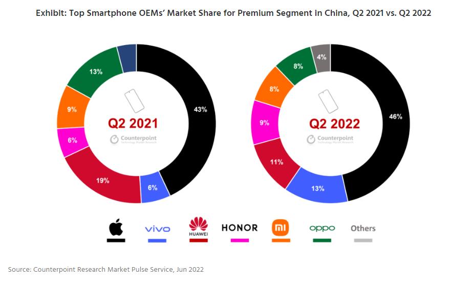 По данным исследовательской компании Counterpoint, по итогам второго квартала текущего года рынок премиальных смартфонов в Китае сократился на 10%. К премиальным моделям были отнесены устройства стоимостью более 400$. При этом отмечается, что, несмотря на снижение, этот сегмент рынка показал лучшие результаты в сравнении с общими показателями рынка смартфонов, который по итогам квартала сократился на 14%. Доля премиальных моделей в общем объёме продаж смартфонов в Китае увеличилась с 31% до 33%. Основным поставщиком премиальных моделей в КНР является компания Apple, на её долю приходится 46% от общего объёма продаж во втором квартале. На второй строчке разместилась компания Vivo с долей продаж 13%. В пятерку лидеров премиального сегмента также входят компании Huawei, Honor и Xiaomi с долями 11%, 9% и 8% соответственно.