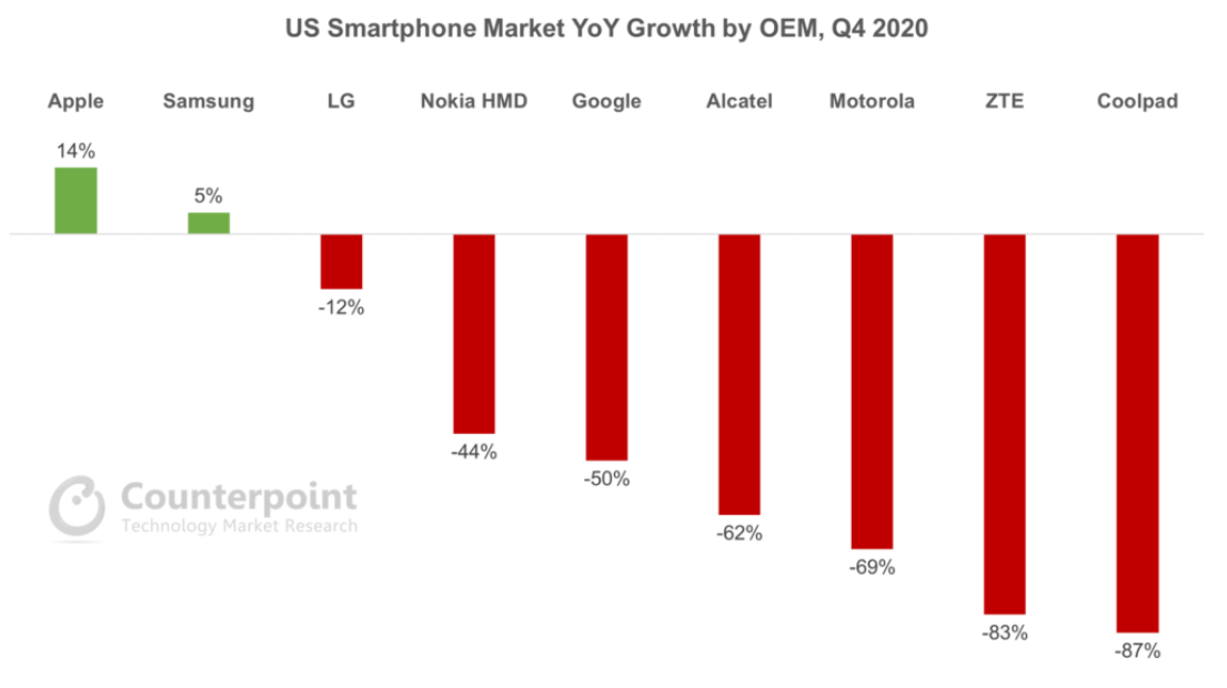 По данным исследовательской компании Counterpoint, в четвёртом квартале 2020 года на рынке США наблюдалось снижение продаж смартфонов на 6% по сравнению с результатами годом ранее. Пандемия коронавируса оказала значительное негативное влияние на розничный американский рынок. При этом отмечается, что выход новой линейки смартфонов компании Apple привёл к росту продаж бренда на 14%, компании Samsung также удалось нарастить свои продажи в квартале на 5%, но все остальные участники рынка показали значительное снижение продаж. Однако, несмотря на снижение продаж в четвёртом квартале, в целом рынок смартфонов постепенно восстанавливается, и в течение последних двух кварталов наблюдался последовательный рост. По сравнению с третьим кварталом, рост составил 24%, в основном он был обеспечен за счёт продаж линейки iPhone 12.