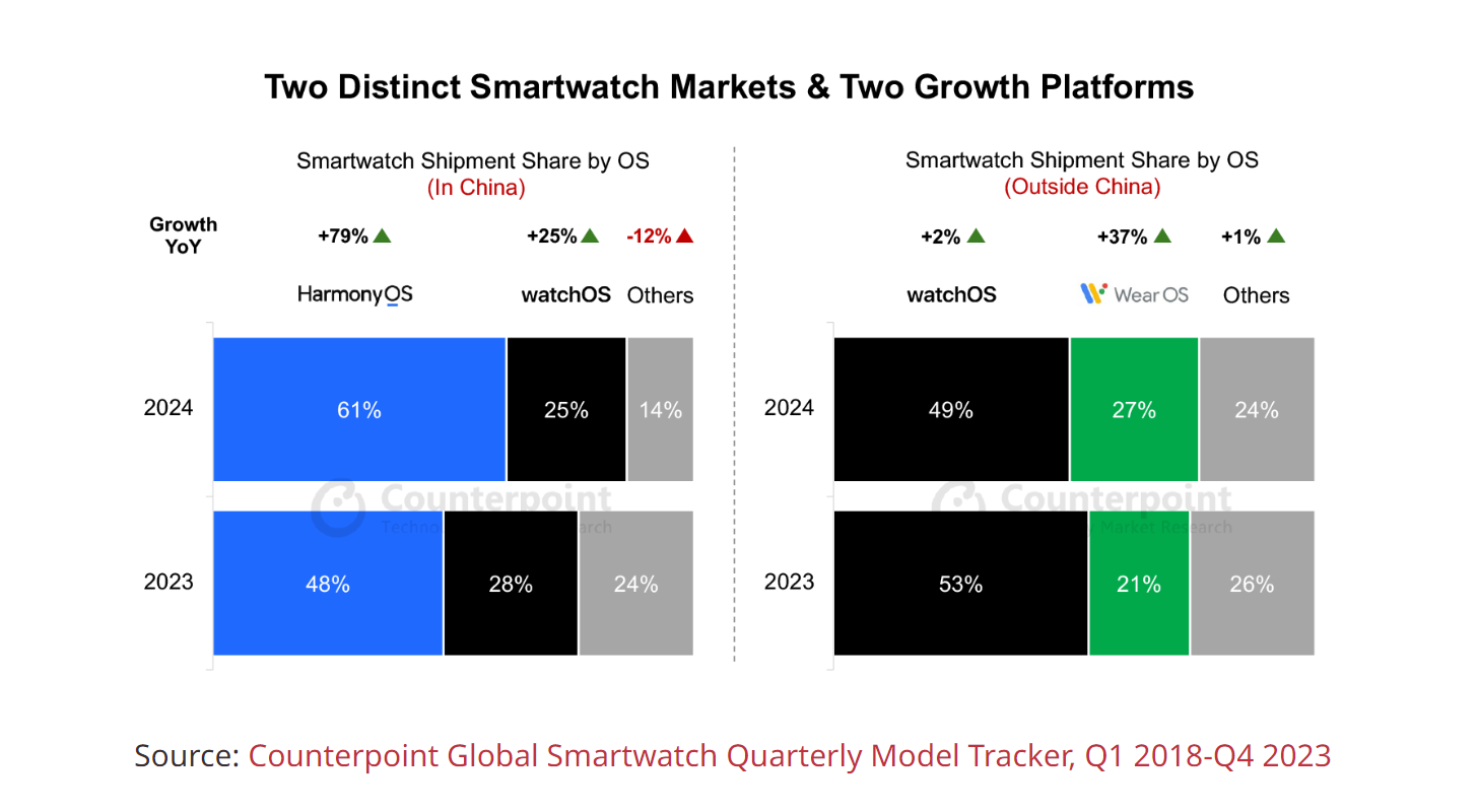 По оценке исследовательской компании Counterpoint, рынок умных часов в этом году вырастет на 15%. Несмотря на доминирование умных часов Apple Watch, в этом году будет наблюдаться значительный рост распространения умных часов на платформах HarmonyOS и Google Wear OS. На рынке Китая будет доминировать платформа HarmonyOS, её доля в нынешнем году на китайском рынке вырастет до 61%. Основными игроками в сегменте умных часов на платформе Google Wear OS будут компании Samsung, OPPO, OnePlus, Xiaomi и сама компания Google. Доля продвинутых моделей на основе Google Wear OS достигнет в нынешнем году 27% на глобальном рынке за пределами Китая. Эксперты по-прежнему фиксируют взрывной рост количества умных часов в базовом сегменте стоимостью до 100$. Такие часы приходят на смену фитнес-трекерам и особенно востребованы на развивающихся рынках.