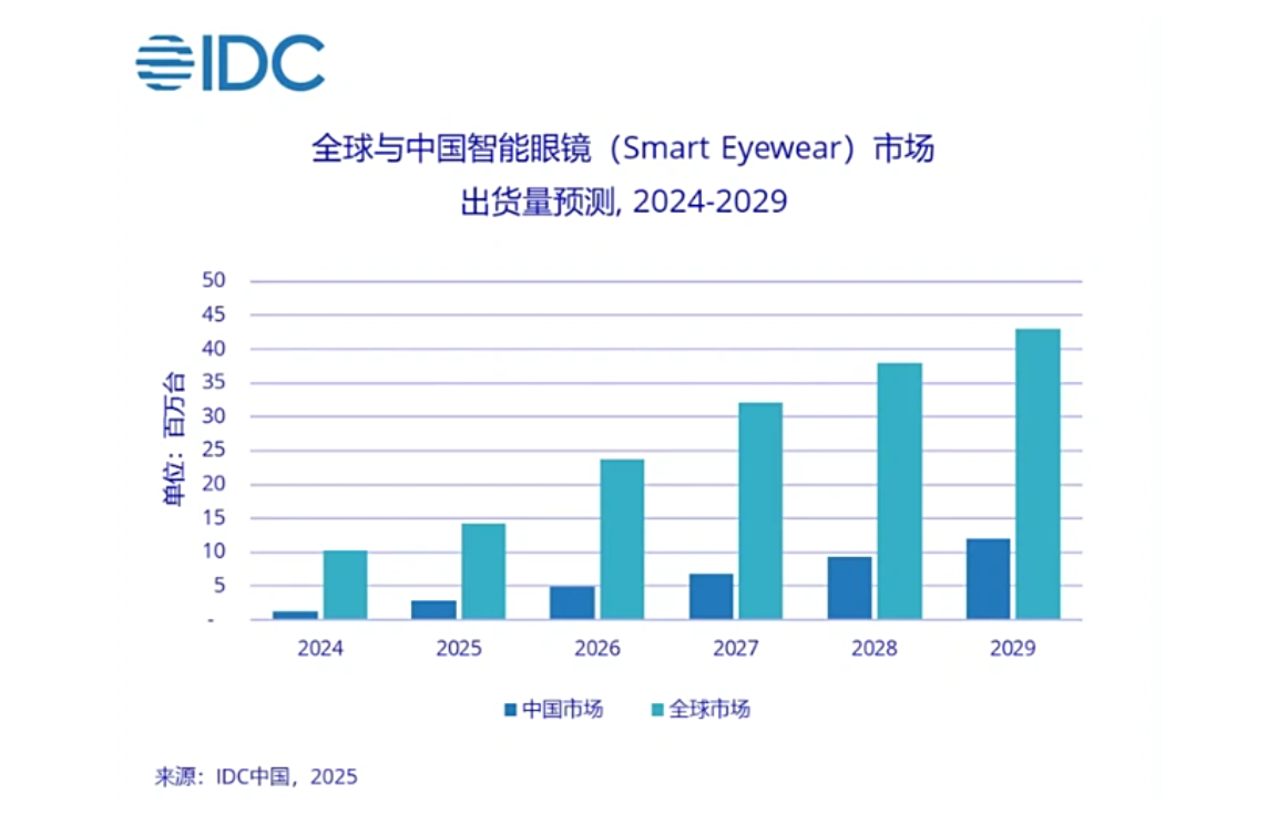 Согласно отчету IDC, мировой рынок смарт-очков переживает стремительный рост. Прогнозируется, что в первой половине 2025 года мировые поставки достигнут 4,065 млн единиц, что на 64,2% превышает показатель прошлого года. К 2029 году объем поставок, по мнению экспертов, превысит 40 млн единиц. Китай станет мировым лидером, демонстрируя среднегодовой темп роста (CAGR) в 55,6% с 2024 по 2029 год.