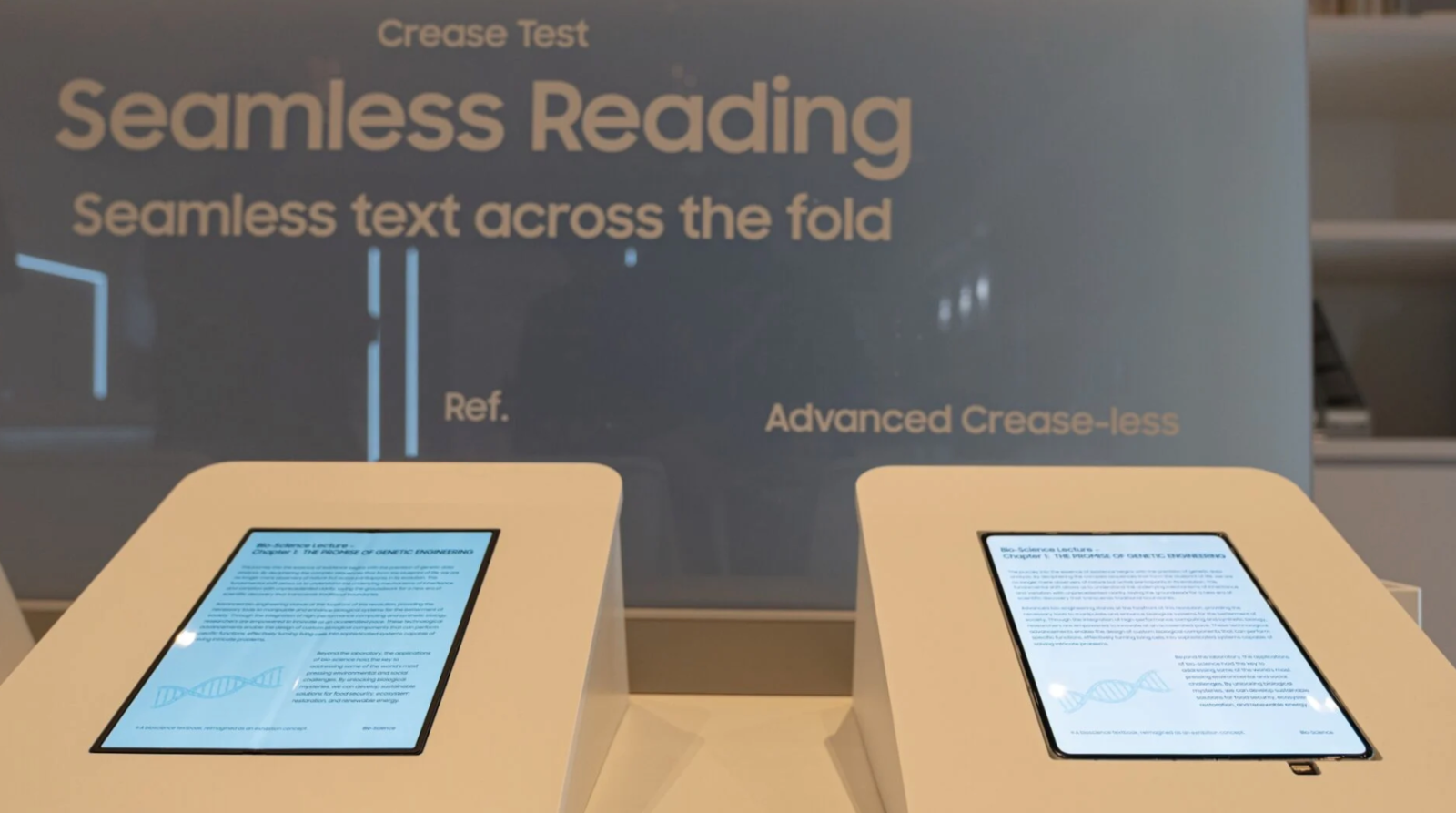 Посетители выставки в Лас-Вегасе смогли лично сравнить новинку с прошлогодним Galaxy Z Fold 7. Если в предыдущей модели след от сгиба был заметно минимизирован, но все же оставался видимым под определенными углами, то новый образец выглядит абсолютно гладким. Для наглядности компания организовала специальную зону тестирования, где два экрана расположены рядом: на новом дисплее текст отображается непрерывно, без искажений в центральной части.