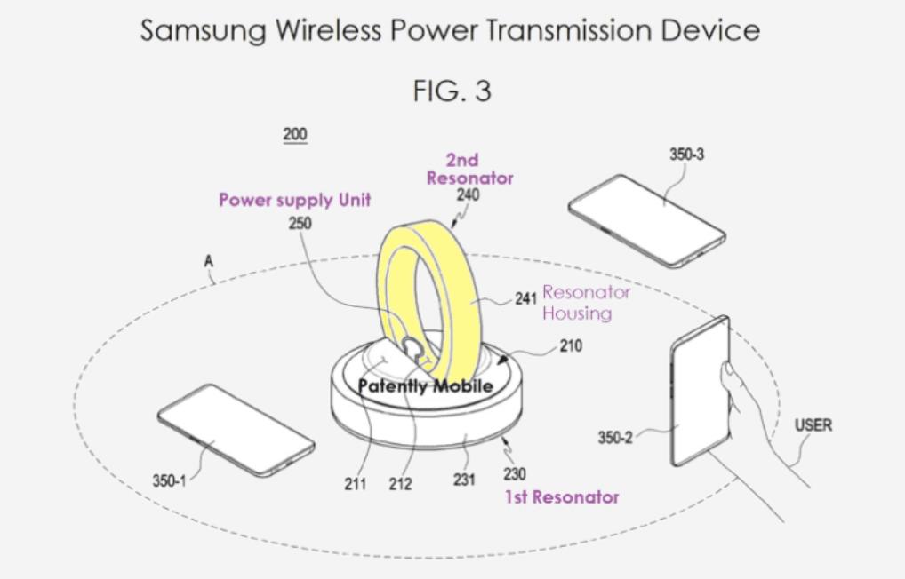 Компания Samsung запатентовала в Корее технологию зарядки нескольких устройств посредством беспроводной зарядки на расстоянии. Устройства могут находиться недалеко от зарядной станции в любом месте в пространстве 360 градусов вокруг. Такое устройство может обеспечивать зарядку смартфонов, наушников и носимых аксессуаров. Несмотря на то, что идея выглядит очень перспективно с точки зрения пользователей, неизвестно, возможно ли её реализовать без использования зарядной станции высокой мощности. Так, например, в настоящий момент в Китае действуют правила, ограничивающие мощность беспроводных зарядных устройств на уровне 50 Вт. Предположительно, беспроводные зарядные устройства высокой мощности могут загрязнять эфир в других используемых диапазонах побочными излучениями, что потенциально может приводить к сбоям в работе различных радиоустройств.