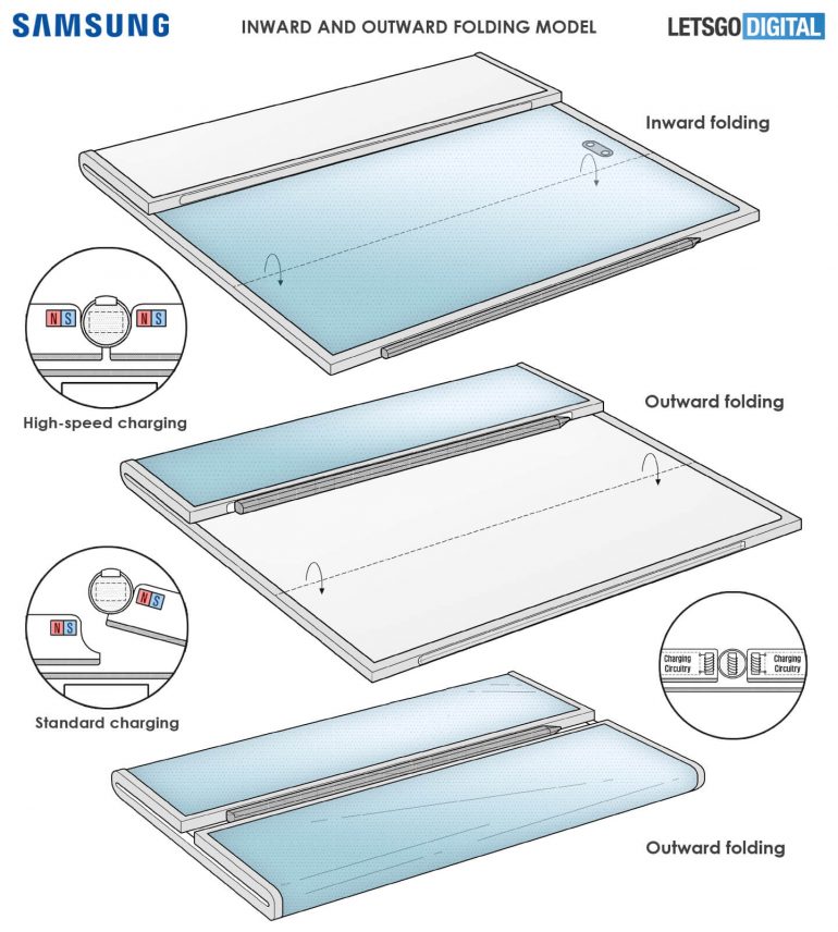 Кроме того, в этой модели Samsung уделила особое внимание стилусу S Pen. Как видно на представленных изображениях, в устройстве нет отдельного отсека для стилуса — его можно хранить в нише между двумя частями дисплея (удерживается на месте с помощью магнитов). Как только смартфон распознает, что S Pen находится в правильном положении, а устройство полностью сложено, то может быть включен режим High-Speed ​​Charge для быстрой подзарядки. Добавим, что данный патент еще раз показывает, насколько далеко компания Samsung продвинулась в разработке складных моделей.