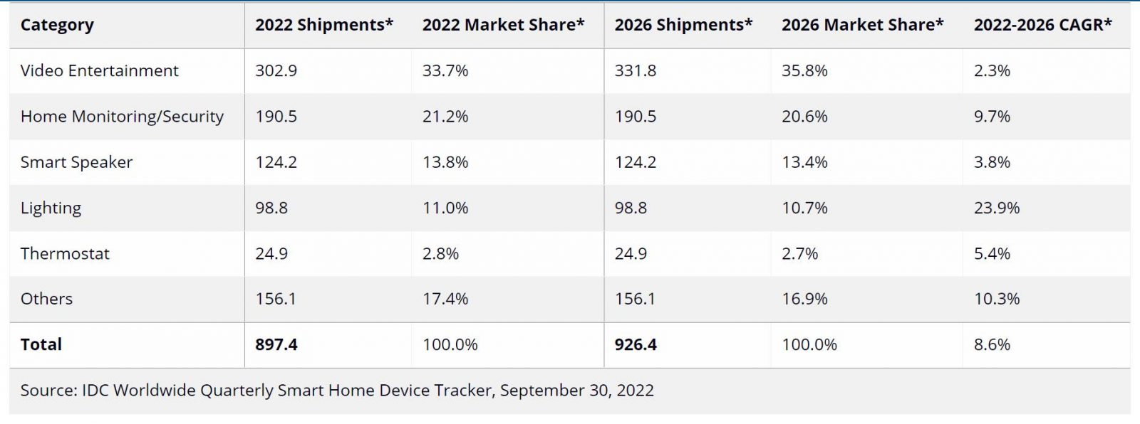 По оценке исследовательской компании IDC, продажи устройств умного дома снижаются вместе с замедлением мировой экономики. Поставки умных колонок, умных телевизоров и устройств для работы со стриминговыми сервисами снижаются в сравнении с подъёмом во время пандемии коронавируса и будут оставаться на слабом уровне до момента подъёма экономики, которого не ожидают ранее 2024 года, всего их будет поставлено в этом году 897 млн единиц. При этом на такие устройства, как интеллектуальное освещение, системы контроля микроклимата, которые помогают экономить средства, сокращение не будет распространяться. Из общего объёма продаж умных устройств основная доля, или 302.9 млн устройств, придётся на системы, связанные с видеоразвлечениями. Систем охраны и мониторинга будет продано 190 млн единиц, умных колонок — 124.2 млн устройств, ещё 98.8 млн придётся на умное освещение и 24.9 млн — на системы контроля климата.