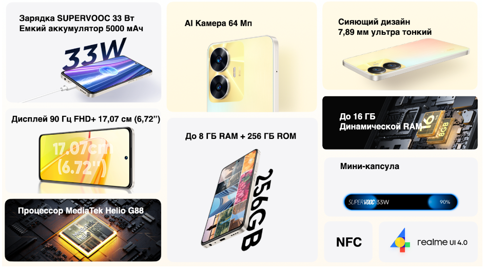 realme C55 оборудовали экраном 6.72 дюйма разрешением FHD+, который поддерживает частоту обновления 90 Гц. Смартфон построен на чипсете MediaTek Helio G88 и поддерживает быструю зарядку мощностью 33 Вт. Фотомодуль получил основную камеру на 64 МП. Производителю удалось выполнить модель в тонком корпусе, толщиной всего 7.89 мм. В смартфоне применен оригинальный интерфейс, который подстраивается под фронтальную камеру и демонстрирует важную для пользователя информацию: состояние аккумулятора, объем потребленных данных, количество шагов. Заявляется, что функционал мини-капсулы в дальнейшем будет развиваться.
