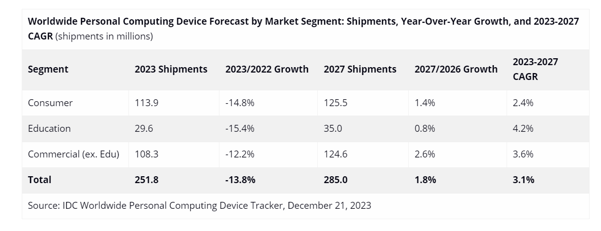 По прогнозу исследовательской компании IDC, в следующем году глобальный рынок персональных компьютеров начнёт восстановление после продолжительного спада продаж, наблюдавшегося в нынешнем году. В третьем квартале было зафиксировано снижение продаж персональных компьютеров на 7.2%, до уровня 68.5 млн устройств. По итогам всего года прогнозируется снижение рынка ПК на 13.8%. Этот и прошедший год демонстрировали постоянное снижение продаж, что, как отмечается, было беспрецедентной ситуацией для рынка ПК. Эксперты ожидают роста рынка в следующем году на 3.4%, чему должно способствовать появление моделей с аппаратной поддержкой искусственного интеллекта, а также продолжающийся переход на операционную систему Windows 11. Новые компьютеры прежде всего будут востребованы корпоративным сегментом, а затем они получат все большее распространение и на более широком рынке.