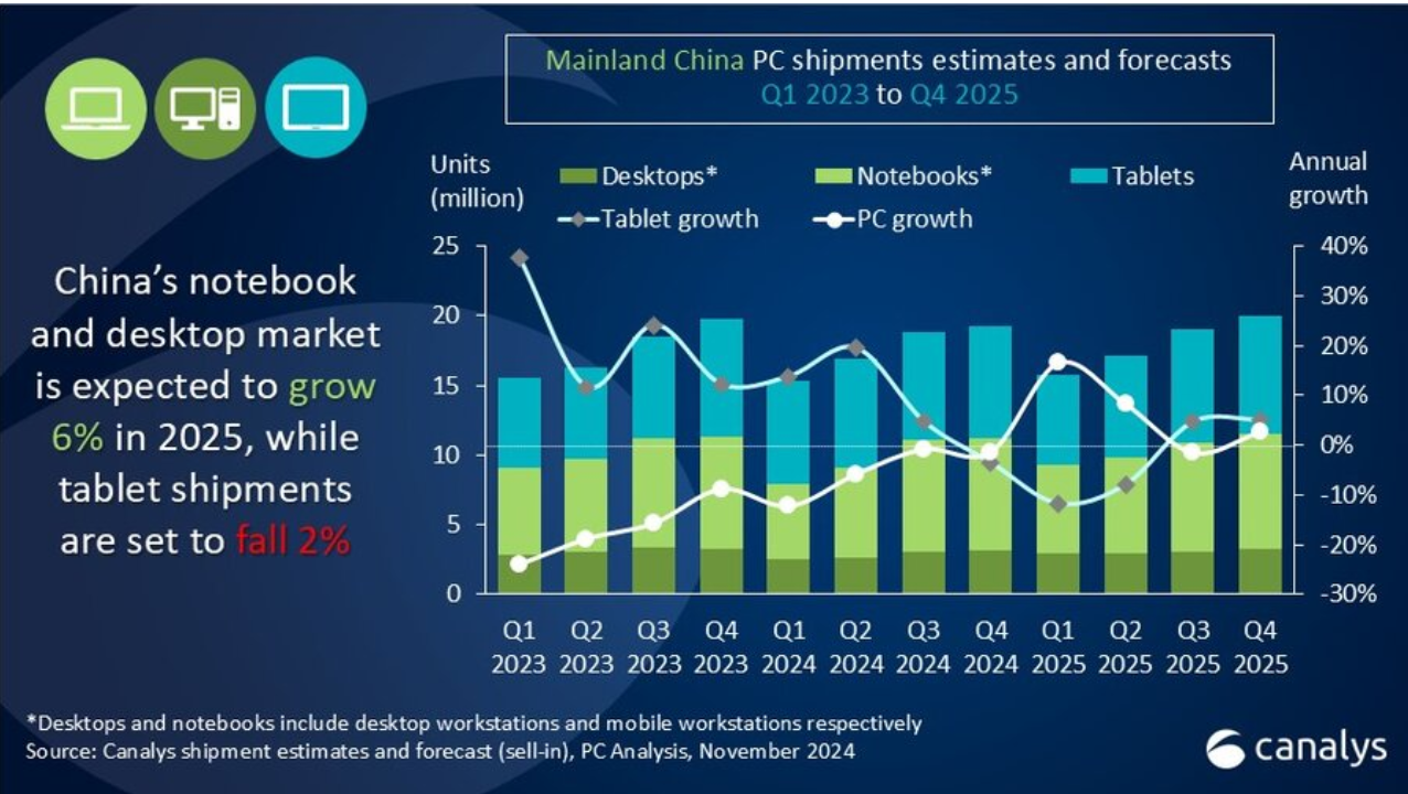 В прошедшем квартале продажи персональных компьютеров на рынке Китая сократились на 1%, всего было продано 11.1 млн устройств, приводит данные исследовательская компания Canalys. При этом прогнозируется, что в следующем году рынок ПК в Китае начнёт расти, и рост может составить 6% по итогам 2025 года. Предполагается, что сегмент настольных компьютеров вырастет на 9%, а рынок ноутбуков подрастет на 4%. В текущем году поставки планшетов покажут рост на 5%, до уровня 7.7 млн устройств, темпы продаж планшетов в следующем году немного снизятся и составят 2% по итогам года. Во второй половине 2024 года на рынок существенное влияние оказали государственные стимулирующие меры в области розничной торговли, что привело к росту продаж персональных компьютеров. Эти меры должны проявить себя в четвёртом квартале текущего года, что, предположительно, позволит рынку ПК продемонстрировать небольшой рост в конце года.