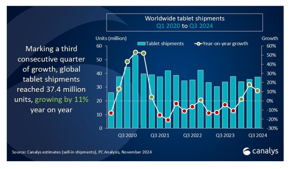 По оценке исследовательской компании Canalys, третий квартал продемонстрировал 11% рост продаж планшетов, всего было реализовано 37.4 млн устройств. Таким образом, рынок планшетов демонстрирует рост уже три квартала подряд, спрос растет как в потребительском, так и в коммерческом сегментах. Компания Apple лидирует на рынке планшетов с отгрузками в объёме 13.6 млн устройств, недавний выпуск компактного планшета iPad mini еще больше усиливает позиции компании. Второе место у компании Samsung с отгрузками в объёме 6.9 млн устройств, компания показала 12% рост в прошедшем квартале. Оставшиеся места в пятерке лидеров рынка — у трех китайских игроков: это компании Lenovo, Xiaomi и Huawei. Отгрузки Lenovo находятся на уровне 2.9 млн устройств, у Huawei 2.8 млн штук, а продажи Xiaomi находятся на уровне 2.5 млн единиц. Эксперты считают, что предпраздничный квартал также продемонстрирует рост и ожидают продолжение роста спроса на планшеты.