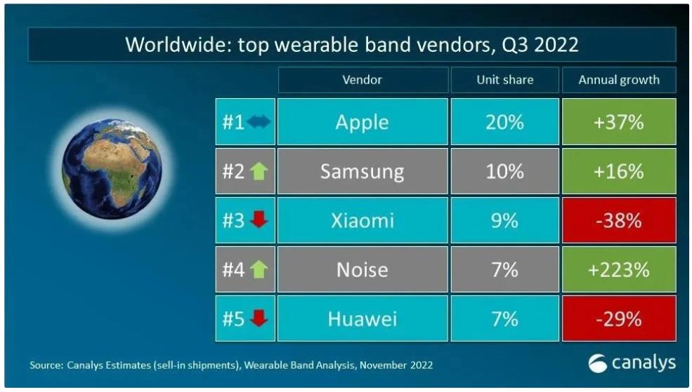 Исследовательская компания Canalys представила свое видение результатов работы рынка носимых браслетов и умных часов. Согласно её оценке, в третьем квартале рынок вырос на 3.4%, всего было продано 49 млн устройств. При этом отмечается сохраняющаяся тенденция роста продаж умных часов и снижение продаж носимых браслетов. Запуск новых моделей умных часов компаниями Apple и Samsung позволил им нарастить свои продажи и занять первое и второе места на рынке с долями 20% и 10% соответственно. Продажи Apple выросли на 37%, а продажи Samsung — на 16% относительно результатов прошлого года. На третьем месте в списке лидеров разместилась компания Xiaomi с долей 9%, однако у неё наблюдается снижение продаж относительно результатов прошлого года на 38%. На четвертом месте разместился индийский производитель, компания Noise, с долей 7%, у этой компании рост составил 223%. Замыкает пятерку лидеров компания Huawei с долей 7%, продажи Huawei сократились на 29%.