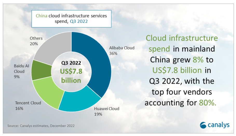 По оценке исследовательской компании Canalys, в третьем квартале текущего года расходы на облачную инфраструктуру в Китае выросли на 8% и достигли $7.8 млрд. Таким образом, Китай обеспечил 12% расходов на развитие облачной инфраструктуры от общего объёма мировых расходов на эту сферу. Однако отмечается, что темп роста расходов на развитие облачной инфраструктуры в Китае сокращается уже третий квартал подряд и впервые за это время он стал ниже 10%. На рынке облаков в Китае более 80% расходов приходится на четыре китайские компании — Alibaba, Huawei, Tencent и Baidu. При этом компания Alibaba доминирует на китайском рынке с расходами, которые занимают 36% от общего объёма, следом за ней идёт компания Huawei с расходами в объёме 19%, и замыкает тройку лидеров компания Tencent с 16% расходов. Четвертый китайский игрок, компания Baidu, обеспечила 9% расходов на этом рынке.