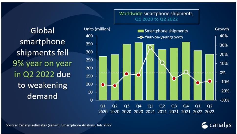 По данным исследовательской компании Canalys, во втором квартале текущего года на мировой рынок было поставлено на 9% меньше смартфонов, чем годом ранее. Рынок испытал серьёзные потрясения в связи с экономической неопределённостью и геополитическими рисками. Лидером мирового рынка смартфонов является компания Samsung, ей принадлежит 21% от мирового объёма поставок. На втором месте — компания Apple с долей продаж в объёме 17%. В пятёрке лидеров рынка также находятся компании Xiaomi, OPPO и Vivo с долями 14%, 10% и 9% соответственно. Производители смартфонов вынуждены корректировать свои производственные планы на второе полугодие в связи с продолжающимися логистическими проблемами, ростом цен на полупроводниковую продукцию и инфляционным давлением.
