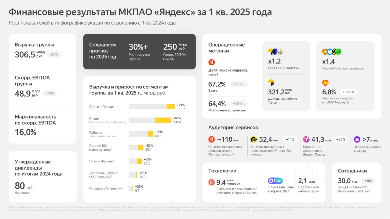 Компания «Яндекс» представила результаты работы в первом квартале текущего года. Согласно данным компании, выручка «Яндекс» в сравнении с аналогичным периодом годом ранее выросла на 34% и достигла уровня 306.5 млрд рублей. Наибольший вклад обеспечивает сегмент «поиск и портал», на долю которого приходится 113.7 млрд рублей выручки при росте на 21%. Второй по объёму сегмент — это «e-com», он принёс компании 104.8 млрд рублей при росте на 60%. Сегмент «райдтех», куда входят такси, каршеринг и самокаты, занял третью строчку по объёму доходов, обеспечив выручку в размере 60.8 млрд рублей при росте на 29%. Доля «Яндекс» в поиске достигла 67.2% и показала рост на 2.7%. Компания сообщает о 41.3 млн подписчиков «Яндекс Плюс» и 52.4 млн активных пользователей «Яндекс Go». Поиском от «Яндекс» ежемесячно пользуются 110 млн пользователей. Общая численность персонала компании составила на конец квартала 94.6 тысяч сотрудников.