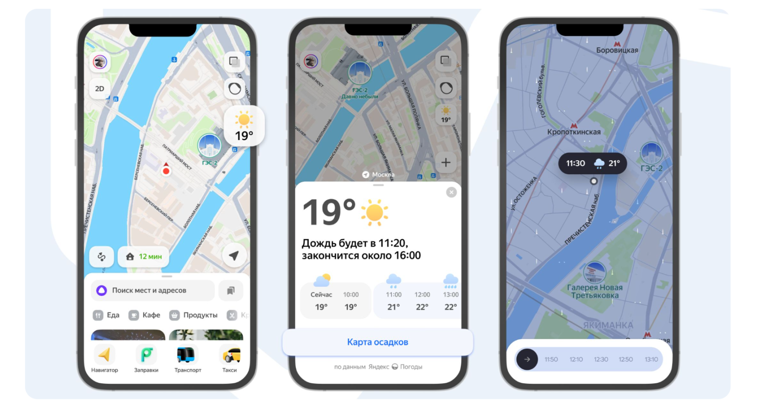 В будущем разработчики планируют интегрировать погодные данные в процесс построения маршрутов в «Картах» и «Навигаторе». Например, если по маршруту ожидается сильный дождь, сервис сможет скорректировать предполагаемое время прибытия и заранее предупредить об осадках.