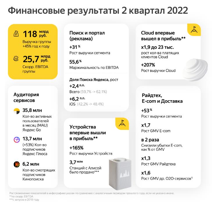 Компания «Яндекс» представила неаудированные данные по результатам работы за второй квартал. Выручка компании выросла на 45% и достигла 118 млрд рублей. Чистая прибыль составила 8 млрд рублей в сравнении с убытками в размере 4.66 млрд годом ранее. Доля «Яндекс» на российском поисковом рынке выросла на 2.4% и составила 62.1%. Выручка связанного с этим сервиса составила 51.2 млрд рублей при росте на 31%. Выручка сервиса электронной коммерции, такси и доставки достигла 56.4 млрд рублей при росте на 53%. Компания отмечает, что впервые сегмент устройств показал прибыль, а рост выручки от него составил 165%, всего было продано 3.7 млн устройств с голосовым помощником Алиса. Компании удалось на 53% увеличить количество подписчиков «Яндекс.Плюс», и теперь их общее число достигло 13.7 млн.