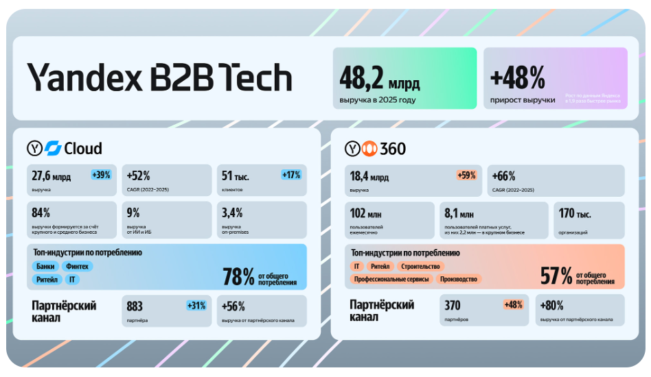 Подразделение Yandex B2B Tech, объединяющее облачную платформу Yandex Cloud и сервис «Яндекс 360», представило финансовые результаты за прошлый год. Направление продемонстрировало уверенный рост во всех ключевых сегментах, особенно в сфере облачных вычислений и аналитики данных.