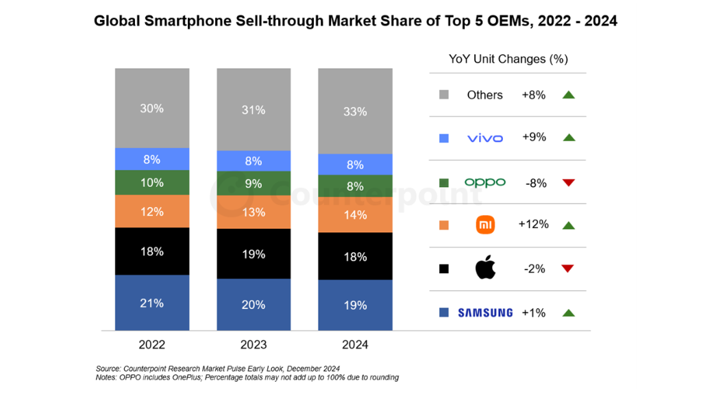 По оценке исследовательской компании Counterpoint, прошедший год стал годом восстановления рынка смартфонов после двух лет падения. За 2024 год глобальный рынок смартфонов вырос на 4%. Компания Samsung по-прежнему занимает первое место по объёму продаж смартфонов с долей 19%, следом за ней идёт компания Apple с долей 18%. Отмечается, что результаты продаж Samsung и Apple практически не изменились по итогам года, у Samsung они выросли на 1%, а компания Apple немного, на 2%, снизила продажи. Третье место среди глобальных игроков принадлежит компании Xiaomi с результатом 14% от всего объёма продаж на мировом рынке. При этом компании Xiaomi удалось нарастить свои продажи на 12%, продемонстрировав самый значительный прирост по итогам года. В пятерке лидеров также находятся компании OPPO и Vivo с долями по 8%, при этом если продажи Vivo выросли на 9%, то продажи компании OPPO, наоборот, снизились на 8%. Эксперты ожидают, что искусственный интеллект поможет производителям смартфонов увеличить свои продажи в нынешнем году, в особенности это будет касаться флагманских устройств.