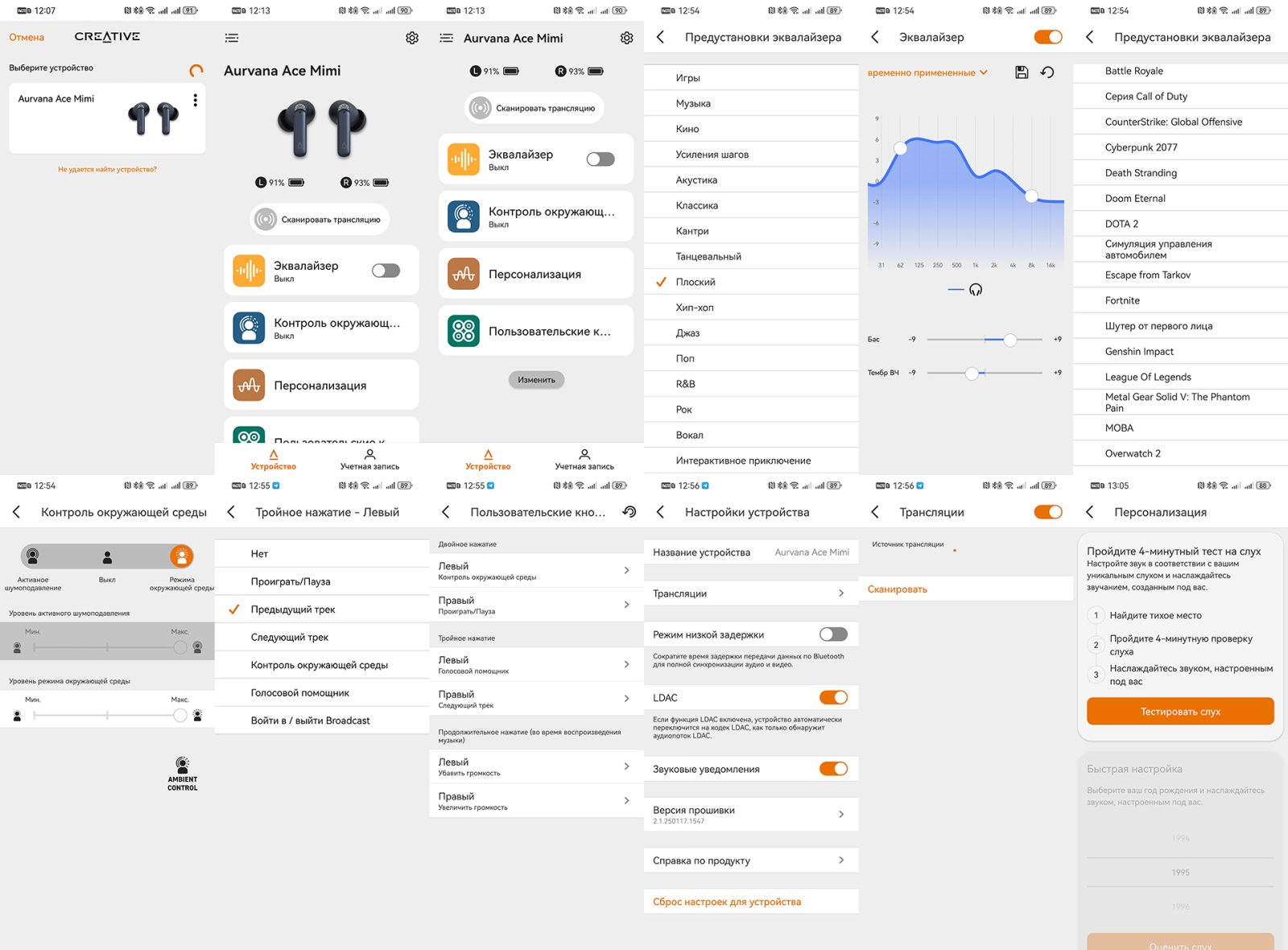 Для наушников доступно два приложения — SXFI и Creative. Первое позволяет сделать виртуальную модель ушной раковины и на её основе эмулировать звук многоканальной акустики. Работает, кстати, только с локальными аудио, стриминговые сервисы не поддерживает. Для работы не обязательна. Вторая же, которая называется Creative, — базовая. Помимо стандартных действий в виде проверки остатков аккумуляторов и обновления прошивки, есть эквалайзер, контроль окружающей среды, пользовательские кнопки и трансляции. Для эквалайзера предложили огромное количество пресетов, причём, заточенных не только на какие-то музыкальные жанры, но ещё и на разнообразные игры, возможность настроить что-то вручную также доступна. Под «контролем окружающей среды» понимается включение активного шумоподавления или режима звуковой прозрачности, а также выбор глубины каждого из них. В «Пользовательские кнопках» лежит настройка нажатий и реакций на них, поддерживаются одиночные, двойные и тройные нажатия плюс удержание. А вот «трансляции» — штука необычная: наушники поддерживают трансляции Auracast, технологии на основе Bluetooth LE, позволяющей передавать звук с одного устройства на большое количество приёмников без необходимости сопряжения с каждым. То есть, принцип как в обычном радио: один передатчик, который вещает «в мир», и куча разнообразных приёмников, которые включаются и отключаются в случайный момент времени и никоим образом не взаимодействуют с передатчиком. Теоретически штука полезная: всякие уведомления в аэропортах, прослушивание передач в общественном месте с помощью индивидуальных наушников и так далее, но я так ни разу и не смог отловить ни одной живой трансляции. А потому ничего не могу сказать про эту функцию.