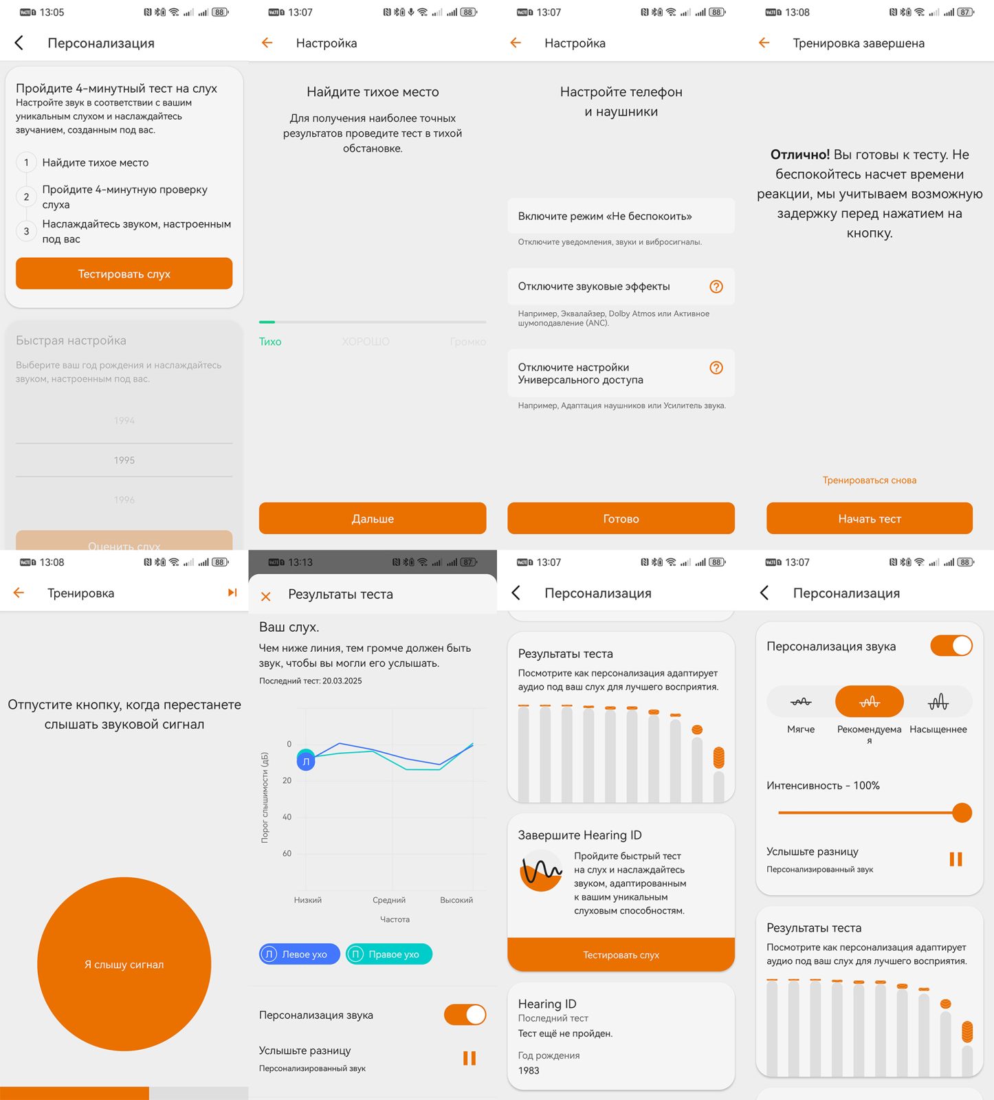 Но самое интересное — это технология Mimi, призванная адаптировать звук наушников под ваши особенности. Для этого вам нужно пройти небольшой четырёхминутный тест прямо в приложении: в наушниках будут проигрываться звуки различной частоты и громкости, а вам надо нажать и держать единственную круглую кнопку на экране всё время, пока вы что-то слышите. По окончании система покажет диаграммы чувствительности и предложит сразу применить настройки к звучанию, причём с разной интенсивностью и насыщенностью. Как обычно, правильного ответа на вопрос «что лучше выбрать» тут нет — только пробовать и подбирать наиболее интересный вариант.