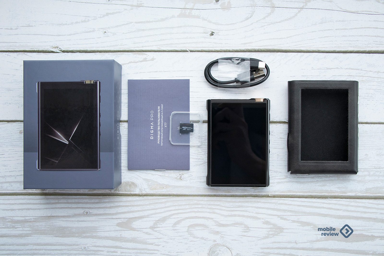 В коробке я, честно говоря, не надеялся найти что-то особенное. Но всё равно, кроме самого плеера, кабеля и инструкции, обнаружил достаточно плотный чехол из кожзаменителя и карту памяти класса U3 на 64 ГБ без указания бренда. С одной стороны, в плеере нет встроенных гигабайтов, с другой же, могли сэкономить и не положить — вон, некоторые блоки питания для смартфонов зажимают, и ничего. Так что ставим «плюс».